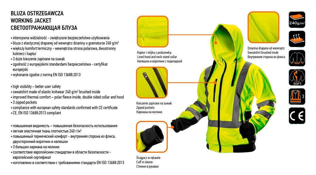 Bluza robocza Neo 81-745-XL (rozmiar XL) to bluza robocza o intensywnej widzialności marki NEO (numer referencyjny 81-745-XL) jest praktycznym rozwiązaniem, które podnosi poziom bezpieczeństwa użytkownika, poprzez sygnalizowanie jego obecności w różnych warunkach oświetleniowych, niezależnie od tego, czy jest to dzień czy noc, przy wykorzystaniu sztucznego oświetlenia, takiego jak światła pojazdów. Wewnętrzna strona bluzy wykonana z materiału polarowego zapewnia wygodę noszenia podczas pracy w niższych temperaturach. Dwuwarstwowy kołnierz i kaptur zwiększają komfort termiczny. Bluza wyposażona jest w trzy przestronne kieszenie, które można zamykać na suwak. Jakość produktu jest gwarantowana przez certyfikat europejski i zgodność z normą EN ISO 13688:2013. Posiadanie certyfikatu CE potwierdza zgodność z europejskimi standardami bezpieczeństwa. Marka NEO spełnia oczekiwania profesjonalistów.