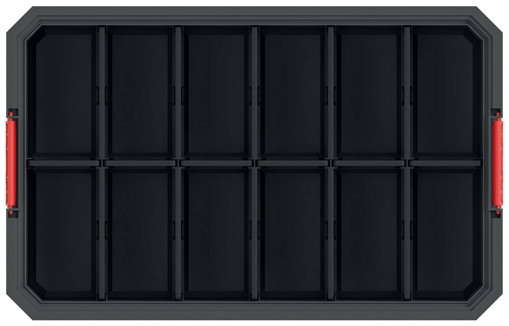 - Zawiera 11 wyjmowanych przegród: Pozwala na elastyczną aranżację przestrzeni wewnętrznej, ułatwiając organizację narzędzi i akcesoriów.