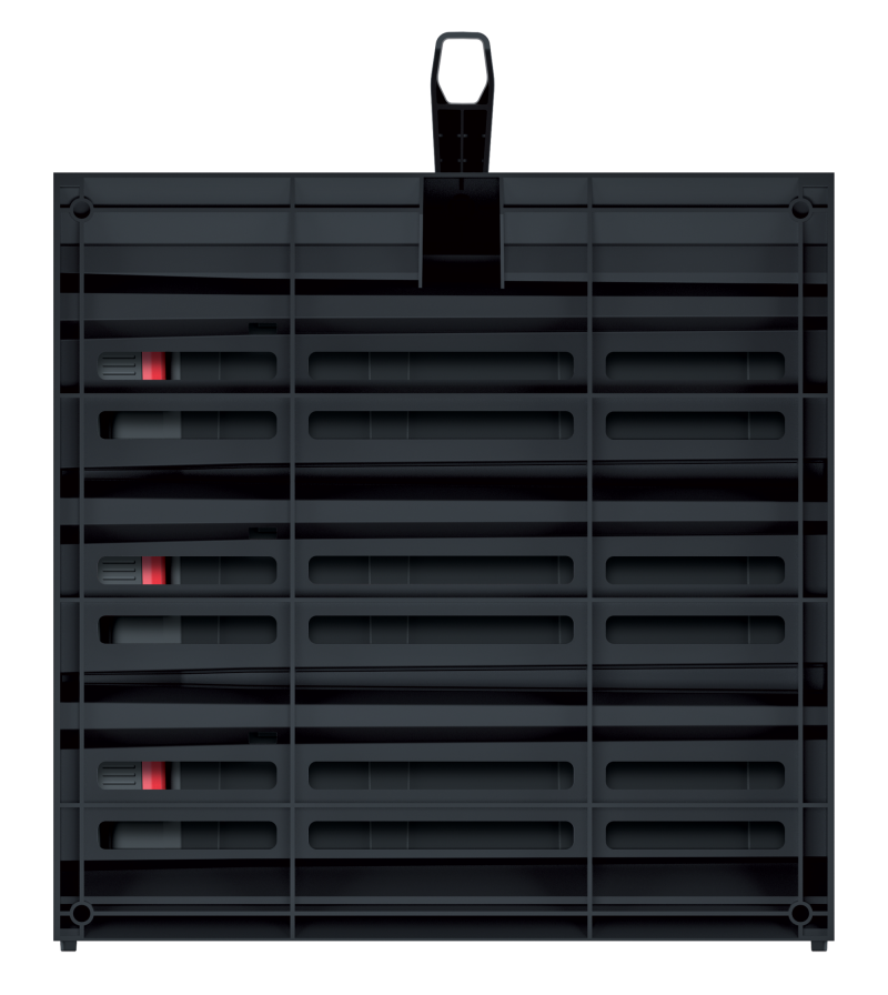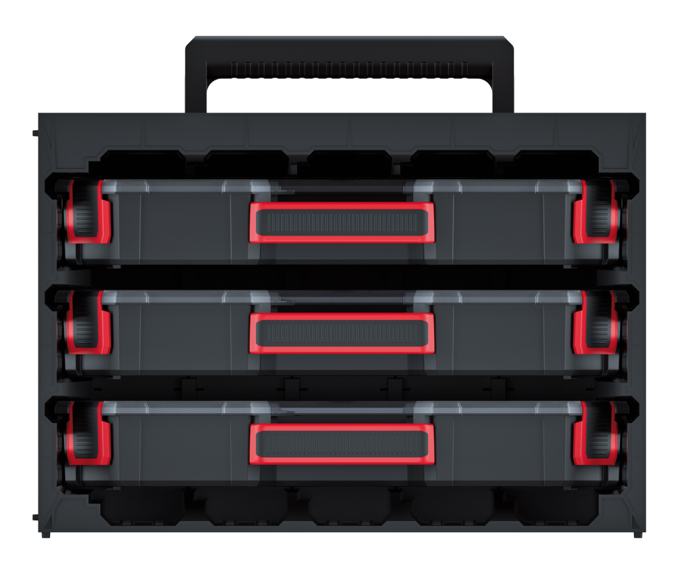 - Zawiera 3 poziomo ułożone organizery serii TAGER o wymiarach 390 x 284 x 60 mm z 12 przegrodami