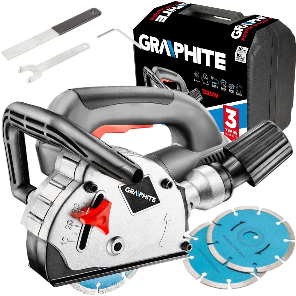 Bruzdownica Graphite 59G370 to elektronarzędzie wyposażone w wydajny silnik o mocy 1320 W, zapewniający prędkość obrotową na poziomie 9000 obrotów na minutę. Urządzenie wyposażone jest w tarczę o średnicy 125 milimetrów pozwala na wykonywanie bruzd o szerokości od 8 - 26 milimetrów oraz głębokości od 8 - 30 mm. Urządzenie wyposażone jest w system odsysania pyłu, który skutecznie zbiera powstający podczas pracy pył, dbając o czystość miejsca pracy. Ergonomiczny przycisk ułatwia obsługę, a praktyczna walizka narzędziowa ułatwia transport i przechowywanie bruzdownicy. Elektronarzędzie sprawdzi się podczas wykonywania bruzd wewnątrz i na zewnątrz pomieszczeń pod instalacje elektryczne i hydrauliczne.