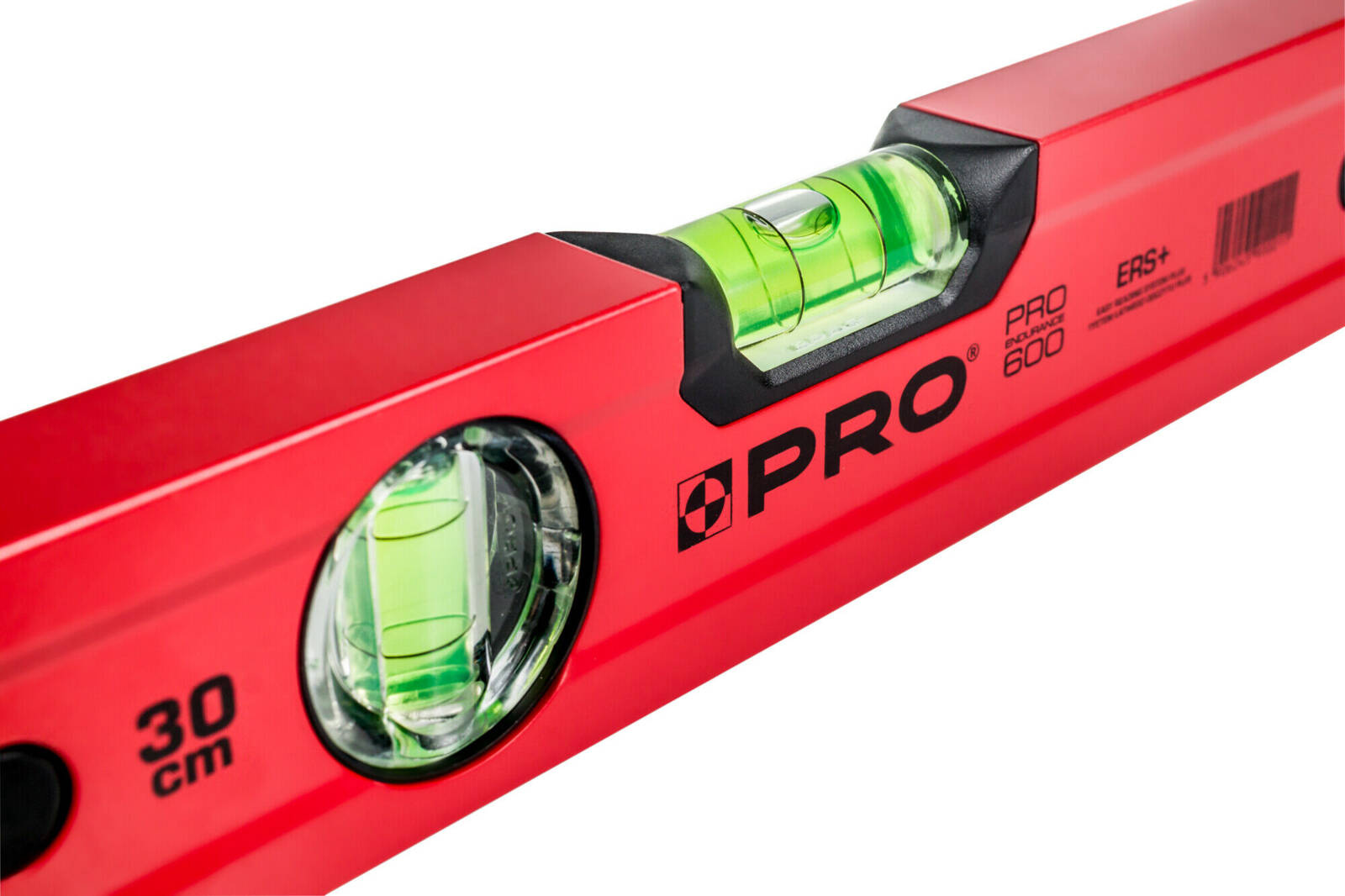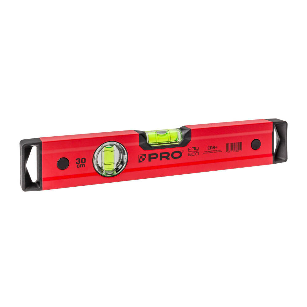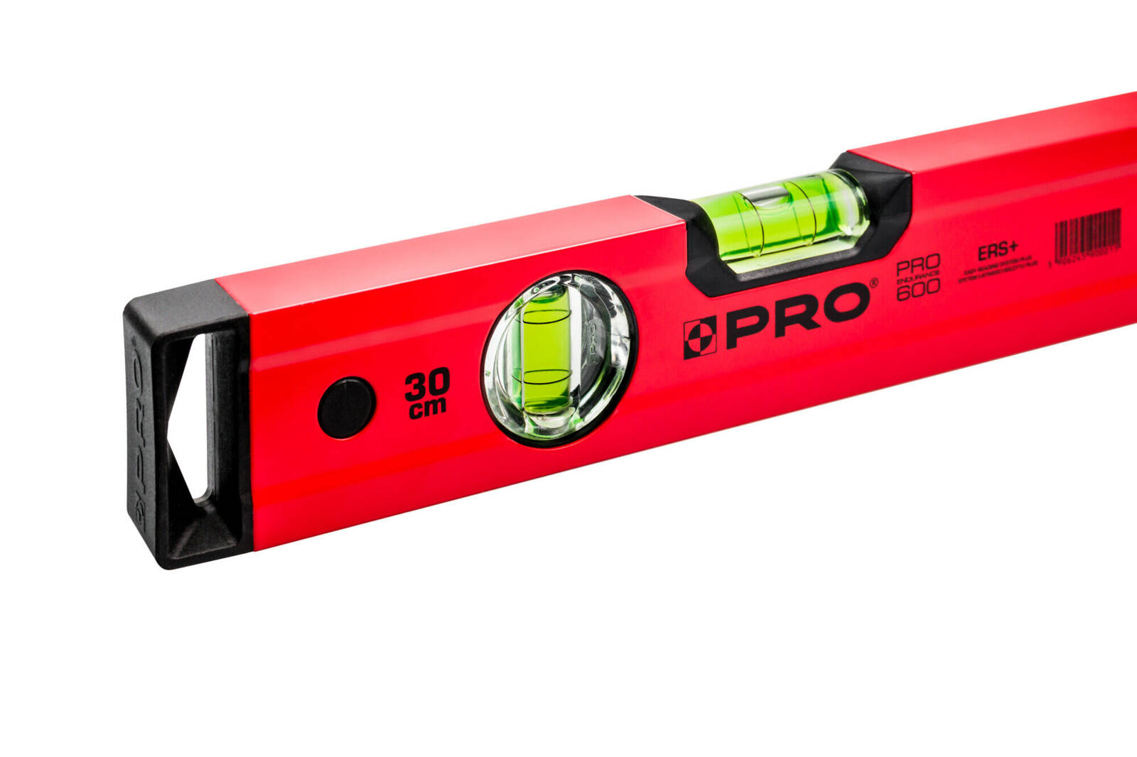 Poziomica czerwona 30 cm seria 600, PRO A1-030 to wysokiej klasy narzędzie pomiarowe, które łączy w sobie precyzję, wytrzymałość i ergonomię. Wykonana z lekkiego, ale solidnego stopu aluminium, gwarantuje dokładność pomiaru na poziomie 0,5 mm/m przy wadze profilu 0,54 kg/m. Jej jednokomorowy profil został zaprojektowany z przetłoczeniami, które nie tylko zwiększają jego sztywność, ale także zapewniają wygodny i pewny chwyt. Dzięki systemowi ERS+ (Easy Reading System) z komorą libelli i soczewką o większym powiększeniu, odczyty są łatwe i precyzyjne. Poziomica wyposażona jest w jedną libellę poziomą i jedną pionową, co umożliwia wszechstronne zastosowanie. Nasadki wykonane z elastomeru, zaprojektowane w celu pochłaniania siły uderzenia przy pionowym upadku, dodają bezpieczeństwa i trwałości, czyniąc ją niezawodnym narzędziem dla profesjonalistów. Konstrukcja libelli minimalizuje wycięcie profilu, co dodatkowo zwiększa trwałość całego narzędzia.