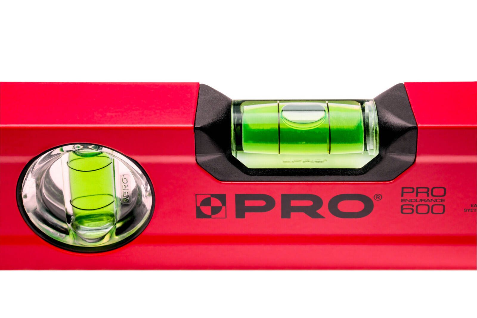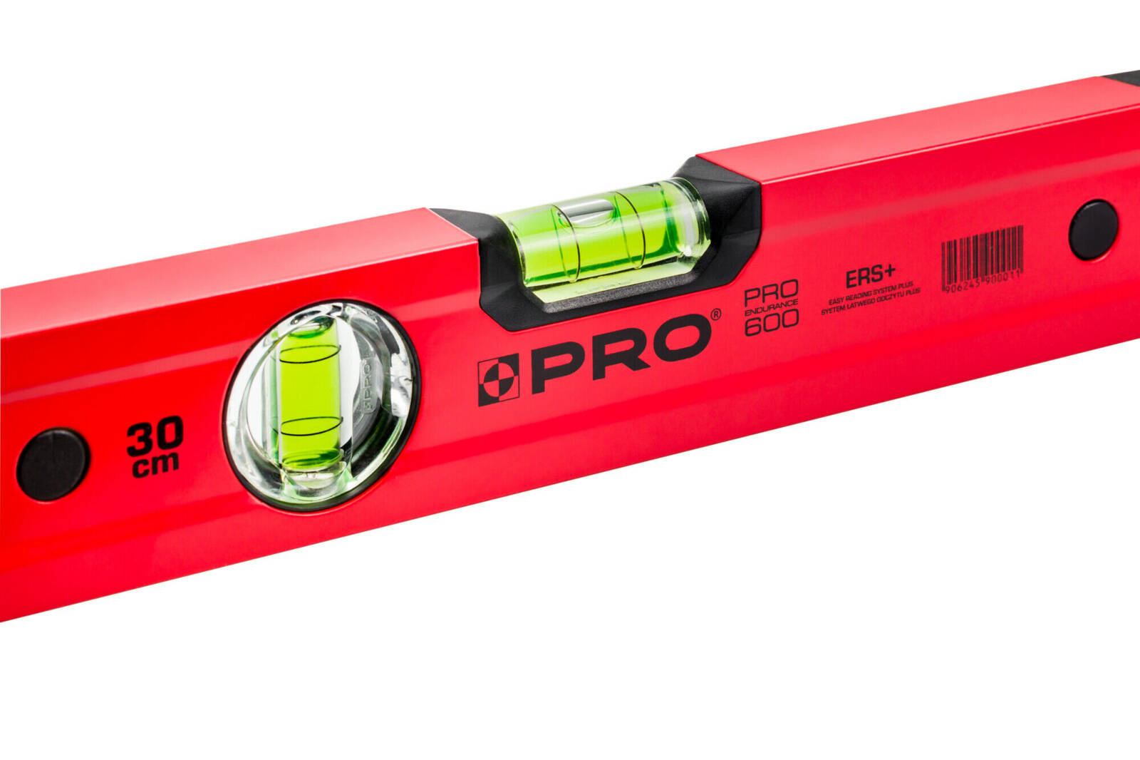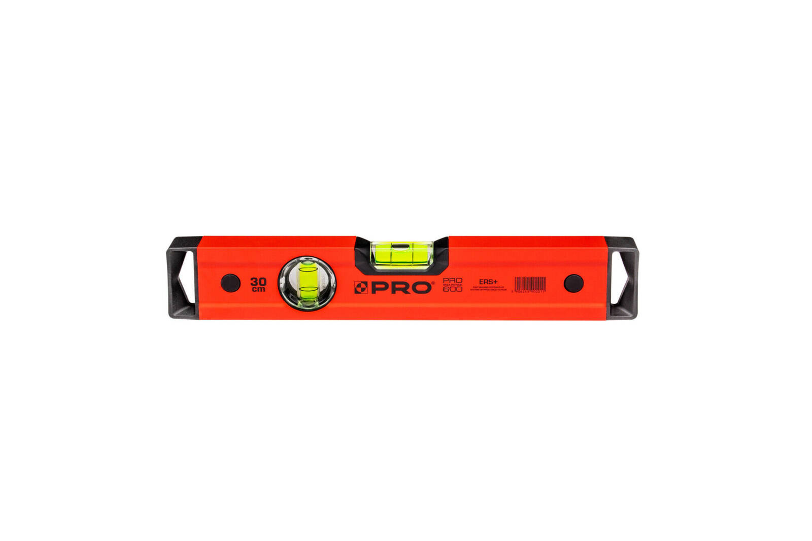 Poziomica czerwona 30 cm seria 600, PRO A1-030 to wysokiej klasy narzędzie pomiarowe, które łączy w sobie precyzję, wytrzymałość i ergonomię. Wykonana z lekkiego, ale solidnego stopu aluminium, gwarantuje dokładność pomiaru na poziomie 0,5 mm/m przy wadze profilu 0,54 kg/m. Jej jednokomorowy profil został zaprojektowany z przetłoczeniami, które nie tylko zwiększają jego sztywność, ale także zapewniają wygodny i pewny chwyt. Dzięki systemowi ERS+ (Easy Reading System) z komorą libelli i soczewką o większym powiększeniu, odczyty są łatwe i precyzyjne. Poziomica wyposażona jest w jedną libellę poziomą i jedną pionową, co umożliwia wszechstronne zastosowanie. Nasadki wykonane z elastomeru, zaprojektowane w celu pochłaniania siły uderzenia przy pionowym upadku, dodają bezpieczeństwa i trwałości, czyniąc ją niezawodnym narzędziem dla profesjonalistów. Konstrukcja libelli minimalizuje wycięcie profilu, co dodatkowo zwiększa trwałość całego narzędzia.