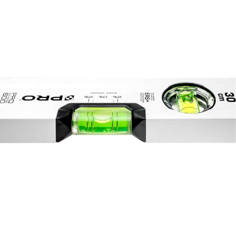 Poziomica PRO600 AB-030 malowana biała z libellą 2% 30 CM to przyrząd o wyjątkowej precyzji, zapewniający dokładne pomiary dzięki dokładności libelli wynoszącej 0,5 mm/m. Oferuje nie tylko funkcjonalność, ale także wygodę użytkowania dzięki jednokomorowemu profilowi z przetłoczeniami, które zwiększają sztywność i stabilność profilu. Dzięki dodatkowym pierścieniom umożliwiającym wyznaczenie spadku 2%, poziomnica ta sprawdza się doskonale nawet przy pracach wymagających precyzyjnego ustawienia kąta nachylenia (np. wyznaczenie spadku pod odpływ liniowy). System ERS+ (Easy Reading System) oraz soczewka o większym powiększeniu ułatwiają odczyt wyników pomiarów. Solidne wykonanie, w tym masywne przetłoczenia boczne i elastomerowe nasadki ANTI SHOCK CAP, gwarantują trwałość i bezpieczeństwo użytkowania. Z kolei jej kompaktowe wymiary (profil 49 x 22 mm) oraz długość 30 cm sprawiają, że jest to idealne narzędzie do precyzyjnych pomiarów w różnych warunkach pracy.