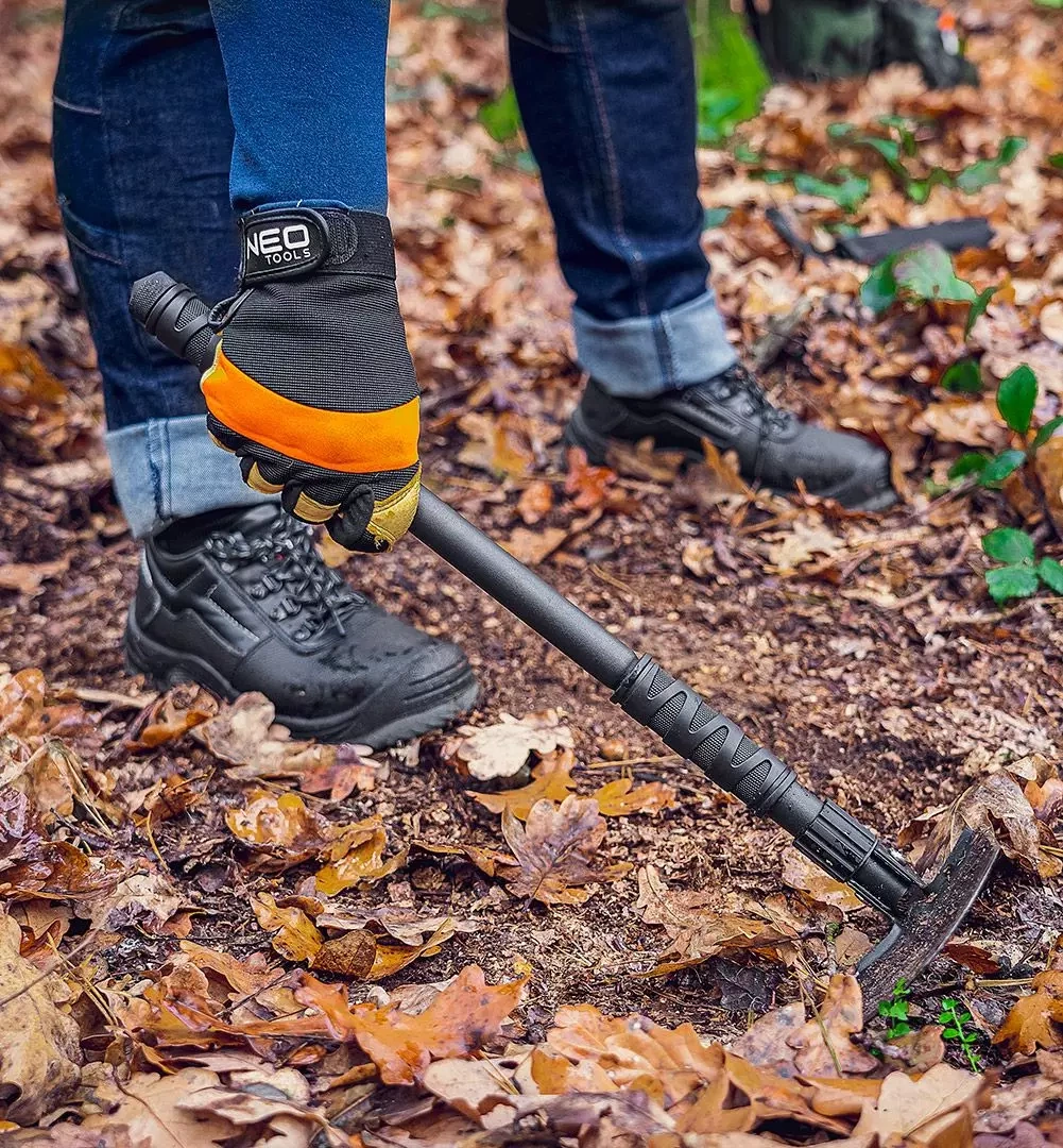 Przy pozyskiwaniu drewna przydatna okaże się niewielka piła przykręcana do uchwytu, natomiast do uzyskania płomienia możesz użyć wchodzącego w skład zestawu krzesiwa. Model NEO Tools 63-122 jest też wyposażony w kilof, otwieracz do butelek, nóż, wybijak do szyb oraz gwizdek alarmowy, dzięki czemu okaże się przydatny różnych sytuacjach. Gumowana rękojeść gwarantuje pewny chwyt i wygodne operowanie saperką.