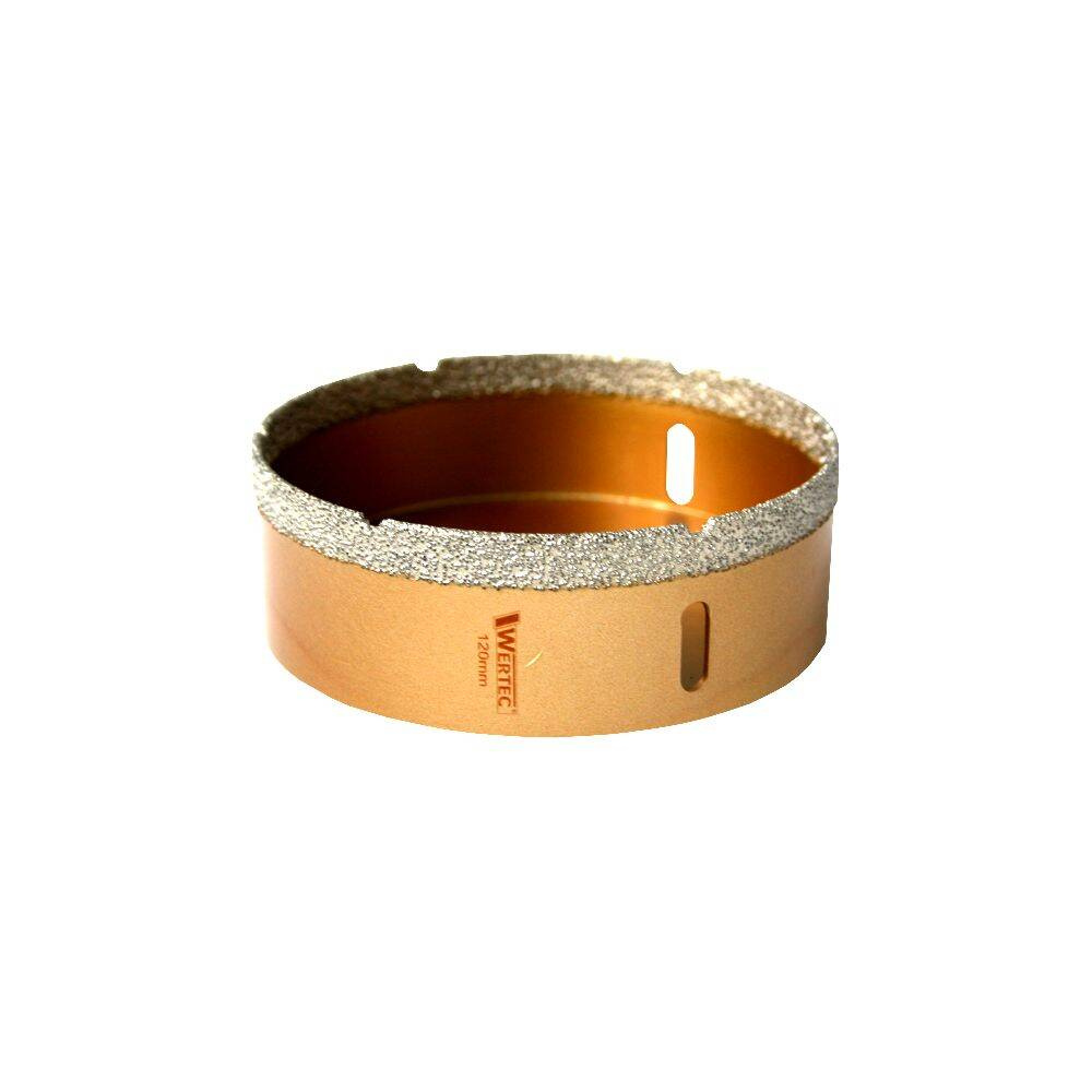 Koronka diamentowa 120x60 mm Wertec to osprzęt najwyższej klasy przeznaczony do wiercenia w glazurze, takiej jak gres, gres porcelanowy, granit czy marmur. Używając tej koronki, możesz łatwo przeprowadzić instalację armatury czy systemów wodnych w dowolnym miejscu. Koronka wykonana jest z materiałów najwyższej jakości, co gwarantuje jej odporność na szybkie zużycie. Otwory rozmieszczone na obwodzie osprzętu nie tylko zapewniają skuteczne chłodzenie, ale także ułatwiają usuwanie urobku. Nasyp diamentowy wykonany z największą starannością zapewnia długotrwałą wydajność koronki, co czyni ją idealnym narzędziem do profesjonalnych zastosowań w pracy z twardymi materiałami.