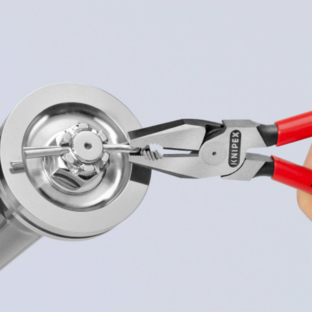 Szczypce uniwersalne (kombinerki) 200 mm o zwiększonym przełożeniu KNIPEX KN0201200 są zaprojektowane tak, aby zmniejszyć siłę potrzebną do ich używania, co przekłada się na większą wygodę i efektywność pracy. Rękojeści wykonane z powlekanego tworzywa sztucznego zapewniają komfortowy i pewny chwyt. Dzięki zastosowaniu optymalnego przełożenia dźwigni, szczypce zaciskają się mocniej, co ułatwia cięcie. Ostrza są hartowane indukcyjnie i osiągają twardość około 63 HRC, co zapewnia ich trwałość i wydajność. Narzędzie doskonale nadaje się do chwytania powierzchni o płaskim i okrągłym przekroju.