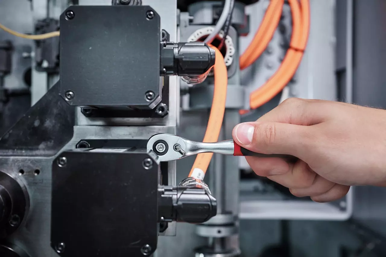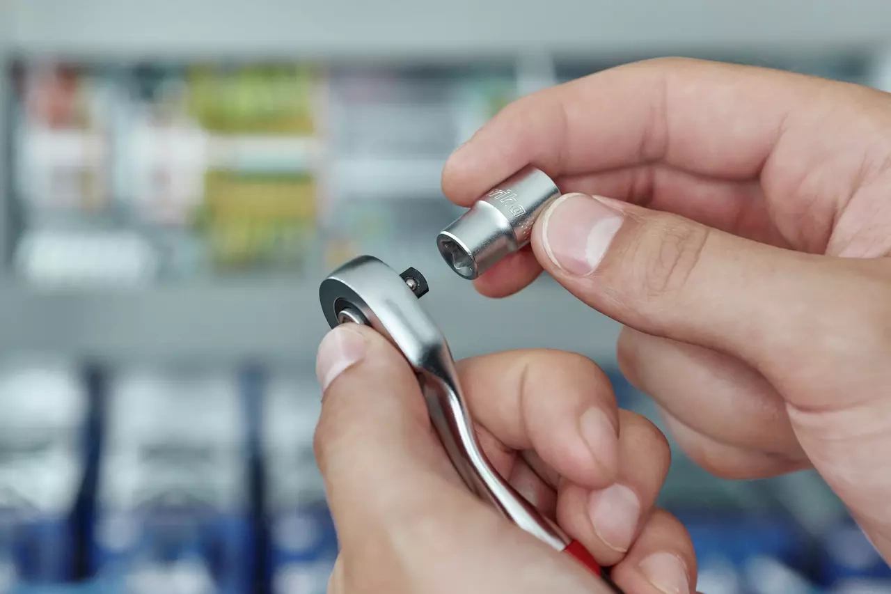 - Szybkie rozłączanie gniazd – przycisk z zabezpieczeniem kulkowym ułatwia wymianę nasadek.