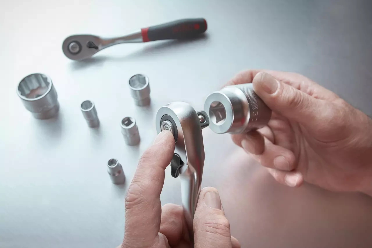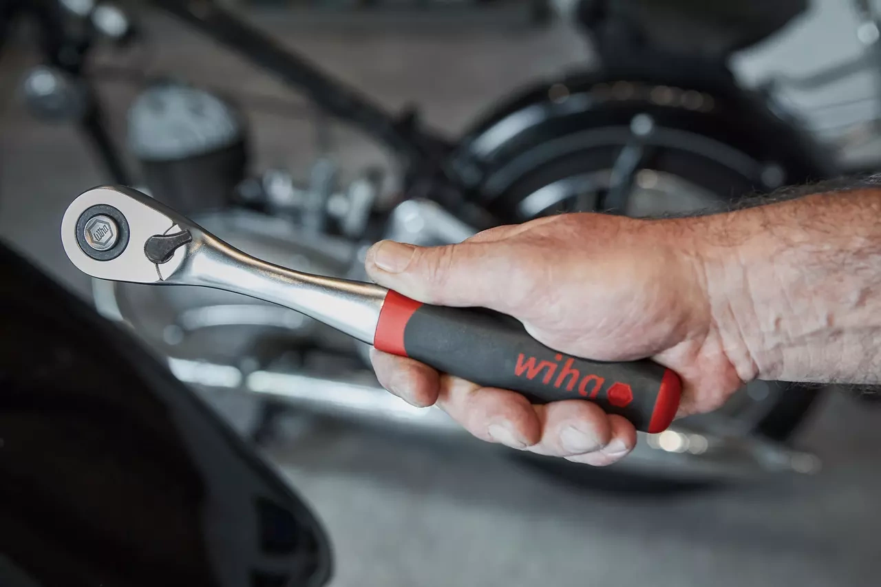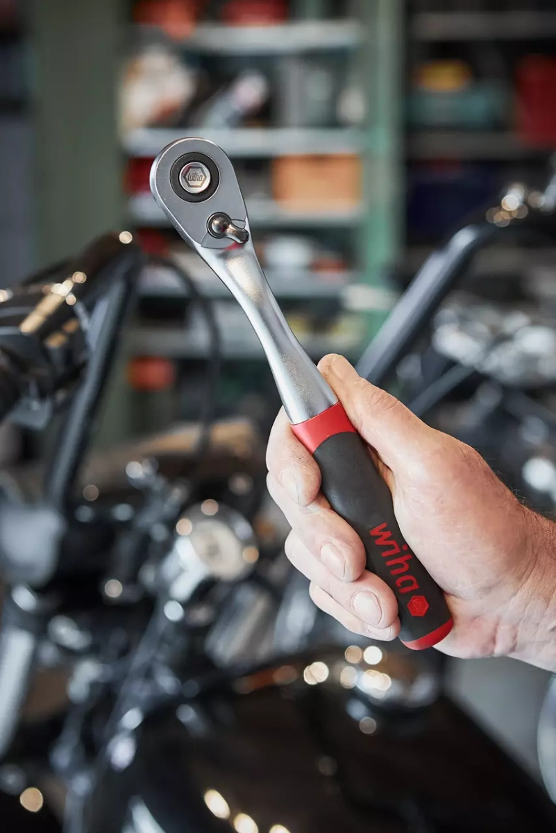 Grzechotka 1/2" x 250 mm Wiha 45627 to narzędzie zaprojektowane z myślą o najbardziej wymagających zadaniach montażowych i instalacyjnych. Wyróżnia się ergonomicznym designem i wyjątkową trwałością, co czyni ją niezastąpioną w pracy zarówno w warsztacie, jak i na placu budowy. Dzięki antypoślizgowej, dwukomponentowej rękojeści zapewnia pewny chwyt i komfortową obsługę nawet podczas długotrwałego użytkowania. Specjalnie wyprofilowany, wygięty kształt grzechotki chroni palce przed urazami, a precyzyjna konstrukcja z drobnym uzębieniem (72 zęby), umożliwia pracę w trudno dostępnych miejscach przy minimalnym kącie ruchu powrotnego wynoszącym zaledwie 5°.