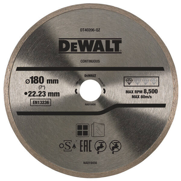 Tarcza tnąca Dewalt DT40206-QZ została specjalnie zaprojektowana do precyzyjnego cięcia ceramiki. Z średnicą 180 mm i otworem o średnicy 22,23 mm, tarcza ta jest kompatybilna z większością szlifierek kątowych. Dewalt DT40206-QZ gwarantuje dokładność i płynność cięcia, co sprawia, że jest idealnym wyborem zarówno dla profesjonalistów, jak i amatorów zajmujących się pracami remontowymi. Dzięki wysokiej maksymalnej prędkości obrotowej wynoszącej 8500 rpm, tarcza ta zapewnia szybkie i efektywne wykonywanie zadań, minimalizując ryzyko uszkodzeń materiału.
