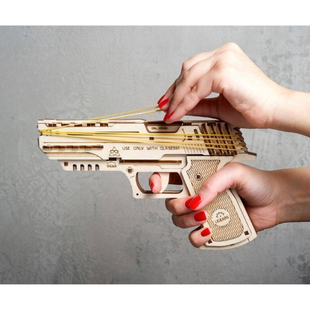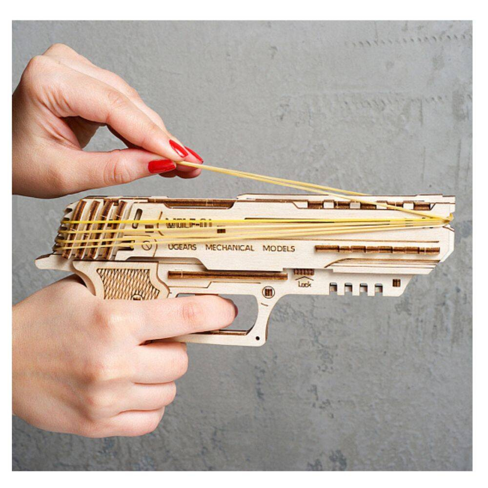 Pistolet Wolf-01 UGEARS 70047 to drewniany model mechaniczny, puzzle 3D do składania.