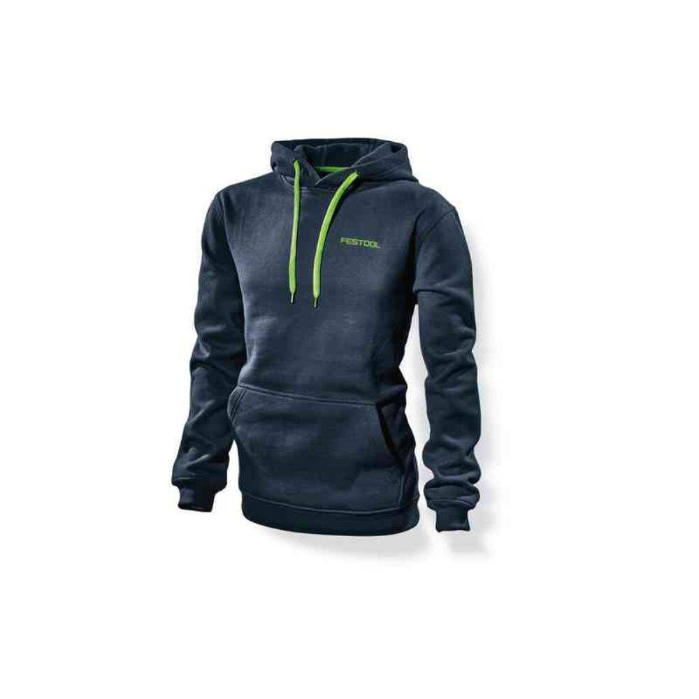 Bluza z kapturem HO-FT2 L Festool 577755 jest niezwykle wygodna i ciepła, wykonana z mieszanki bawełny i poliestru. Ubranie jest wytrzymałe, dzięki czemu posłuży Ci przez dłuższy czas, i sprawdzi się jako uzupełnienie odzienia roboczego. Przytwierdzony kaptur ze ściągaczem w kolorze neonowej zieleni podkreśla powiązanie z marką Festool oraz chroni przed zimnem. Dodatkowo, na bluzie znajduje się kieszeń, w której możesz przechowywać najpotrzebniejsze rzeczy. Ściągacze na końcach rękawów i w pasie sprawiają, że bluza dopasowuje się do Twojego ciała. Krój bluzy jest uniwersalny, dlatego jest unisex i może być noszona przez każdego. Bluza jest w kolorze granatowym, a na lewej stronie torsu znajduje się nadruk z logotypem Festool.