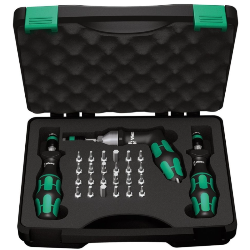 Zestaw wkrętaków dynamometrycznych Wera 05350451001 2,5-55,0 to profesjonalne narzędzie zaprojektowane z myślą o precyzyjnym dokręcaniu śrub z możliwością ustawienia momentu obrotowego w zakresie od 2,5 do 55,0 in. lbs. Dzięki łatwemu w obsłudze systemowi ustawiania momentu oraz czytelnej skali, użytkownik może szybko i dokładnie dostosować narzędzie do swoich potrzeb, z dokładnością wynoszącą ± 6%. Zestaw zawiera dwa wkrętaki dynamometryczne proste oraz jeden nastawny, z uchwytem szybkomocującym Rapidaptor, który umożliwia błyskawiczną wymianę końcówek i kluczy nasadowych. W zestawie znajdują się różnorodne bity TORX®, TORX PLUS® oraz HEX, co zapewnia wszechstronność zastosowań tego kompletu narzędzi.