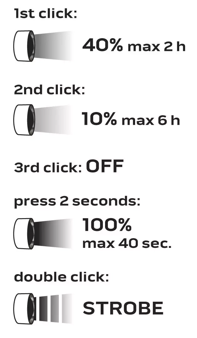 - 4 tryby świecenia: 100% (max. 40 sekundy), 40%, 10%, stroboskop