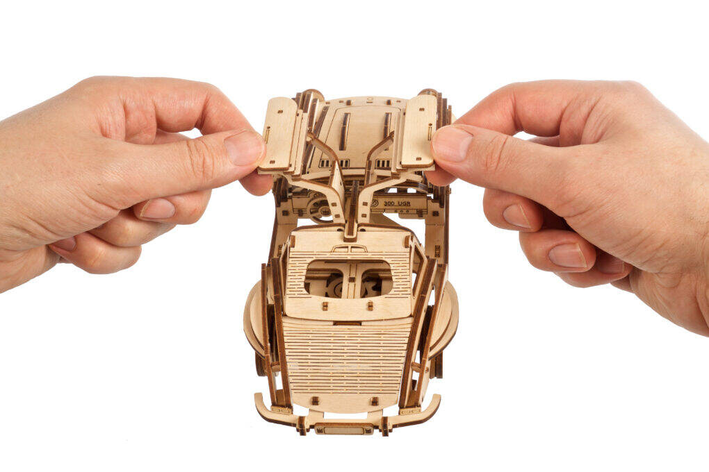 Winged Sports Coupe oferuje dwa tryby działania: samochód można nakręcić za pomocą klucza zapadkowego umieszczonego pod podwoziem lub po prostu pociągnąć go do tyłu i puścić, aby poruszał się samodzielnie. Otwierana maska kryje wewnątrz drewniany silnik, który stanowi serce tego modelu. Solidne wykonanie z naturalnych materiałów oraz dbałość o detale, jak otwierane drzwi motylkowe, nawiązują do klasycznych sportowych samochodów. Model Winged Sports Coupe to doskonały pomysł na prezent, który zadowoli zarówno dorosłych, jak i młodszych pasjonatów.