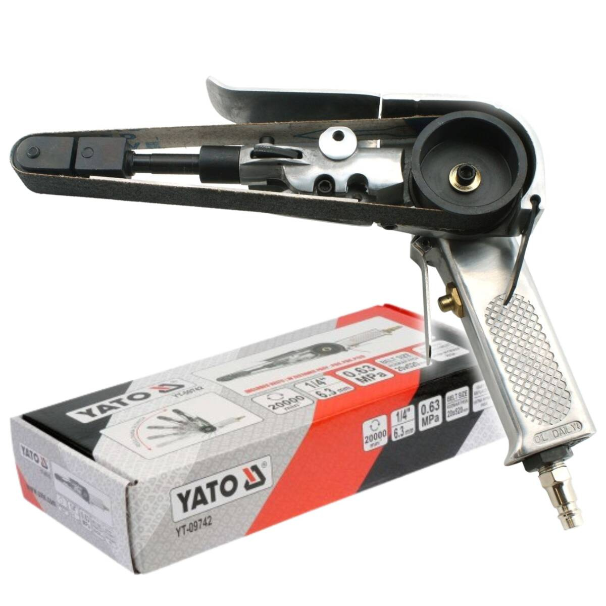 Pneumatyczna szlifierka taśmowa Yato YT-09742 to precyzyjne narzędzie zaprojektowane do efektywnego szlifowania i polerowania różnorodnych powierzchni. Zasilana sprężonym powietrzem, charakteryzuje się wysoką prędkością obrotową wynoszącą 20 000 obr./min, co pozwala na szybkie i dokładne wykonywanie prac. Szlifierka wykorzystuje taśmy ścierne o wymiarach 20 x 520 mm, co czyni ją wszechstronnym narzędziem do obróbki metali, drewna czy tworzyw sztucznych.