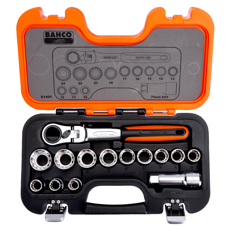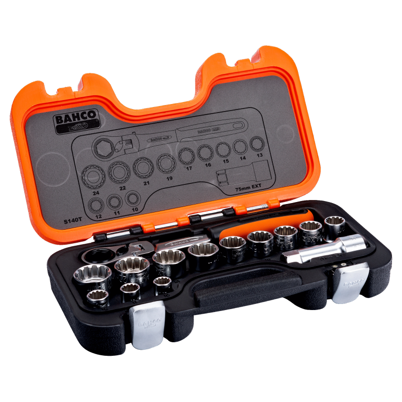 Zestaw nasadek z grzechotką Bahco S140T 14 el. to wysokiej jakości zestaw narzędzi, idealny dla profesjonalistów i majsterkowiczów, którzy cenią solidność i trwałość. Zestaw składa się z 14 elementów, w tym 12 nasadek wykonanych ze stali stopowej oraz grzechotki przelotowej z przegubem, która dzięki 72 zębom pozwala na precyzyjne operacje w ograniczonych przestrzeniach. Całość umieszczona w walizce z polietylenu wysokiej gęstości (HDPE) umożliwiającej bezpieczne przechowywanie i łatwy transport zestawu.