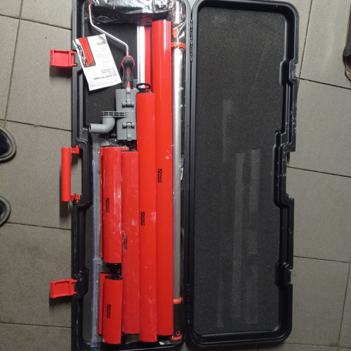 Dodatkowo zestaw wyposażono w teleskopowy kij, który w połączeniu z adapterem umożliwia wygodne szpachlowanie wyżej położonych powierzchn oraz wałek o szerokości 22 cm, z ergonomicznym dwukomponentowym uchwytem, który ułatwia równomierne nakładanie gładzi. Całość zestawu dostarczana jest w wytrzymałej walizce odpornej na uderzenia walizce o długości 110 cm.