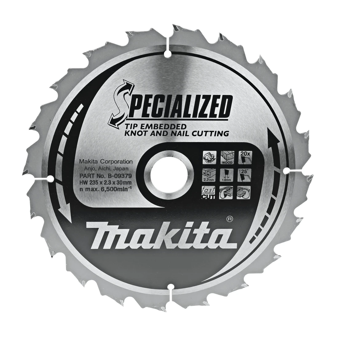 Tarcza do cięcia drewna 235x30 mm Makita B-09379 to specjalistyczny osprzęt zaprojektowany do pracy przy wymagających zadaniach, takich jak cięcie drewna z gwoździami czy sękami. Dzięki zastosowaniu zębów z węglika spiekanego zintegrowanych z korpusem tarczy, produkt charakteryzuje się wyjątkową wytrzymałością i trwałością, co pozwala na długie okresy eksploatacji bez konieczności częstej konserwacji. 20 zębów o kącie natarcia wynoszącym 25° zapewnia szybkie, precyzyjne i bezpieczne cięcie nawet w wymagających materiałach. Tarcza Makita B-09379 to idealny wybór dla profesjonalistów, którzy potrzebują niezawodnego rozwiązania do cięcia drewna z metalowymi elementami.