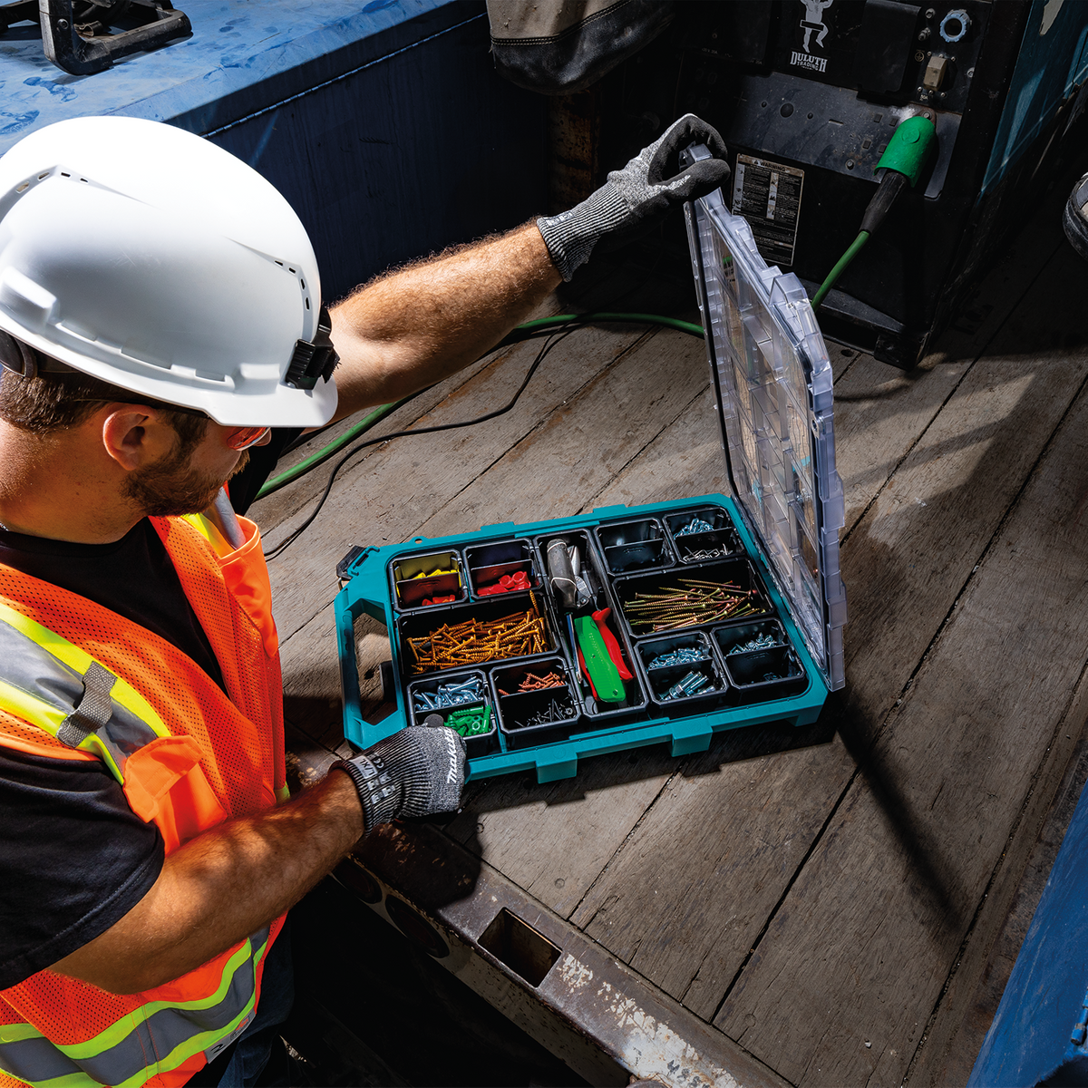 Organizer Makita MakTrak P-91051 to nowoczesne rozwiązanie modułowe do przechowywania narzędzi i akcesoriów na placu budowy. Oferuje do 50% większą pojemność niż wiodący konkurenci, zapewniając wygodne przechowywanie o pojemności 7,85 litra. Dzięki dużym, przyjaznym dla użytkowników zatrzaskom i przezroczystej pokrywie, możliwe jest łatwe sprawdzenie zawartości bez potrzeby otwierania organizera.
