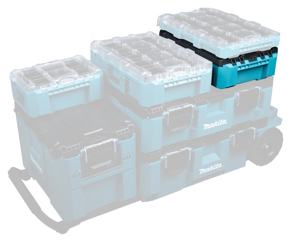 Makita MakTrak P-91039 wyróżnia się solidną konstrukcją z odpornego na uderzenia kopolimeru, który zapewnia trwałość i odporność na trudne warunki panujące na budowie. Głębokie tacki doskonale sprawdzają się do przechowywania większych narzędzi ręcznych, natomiast płytkie tacki z licznymi przegrodami są idealne do organizacji drobnych elementów, takich jak śruby czy nakrętki.