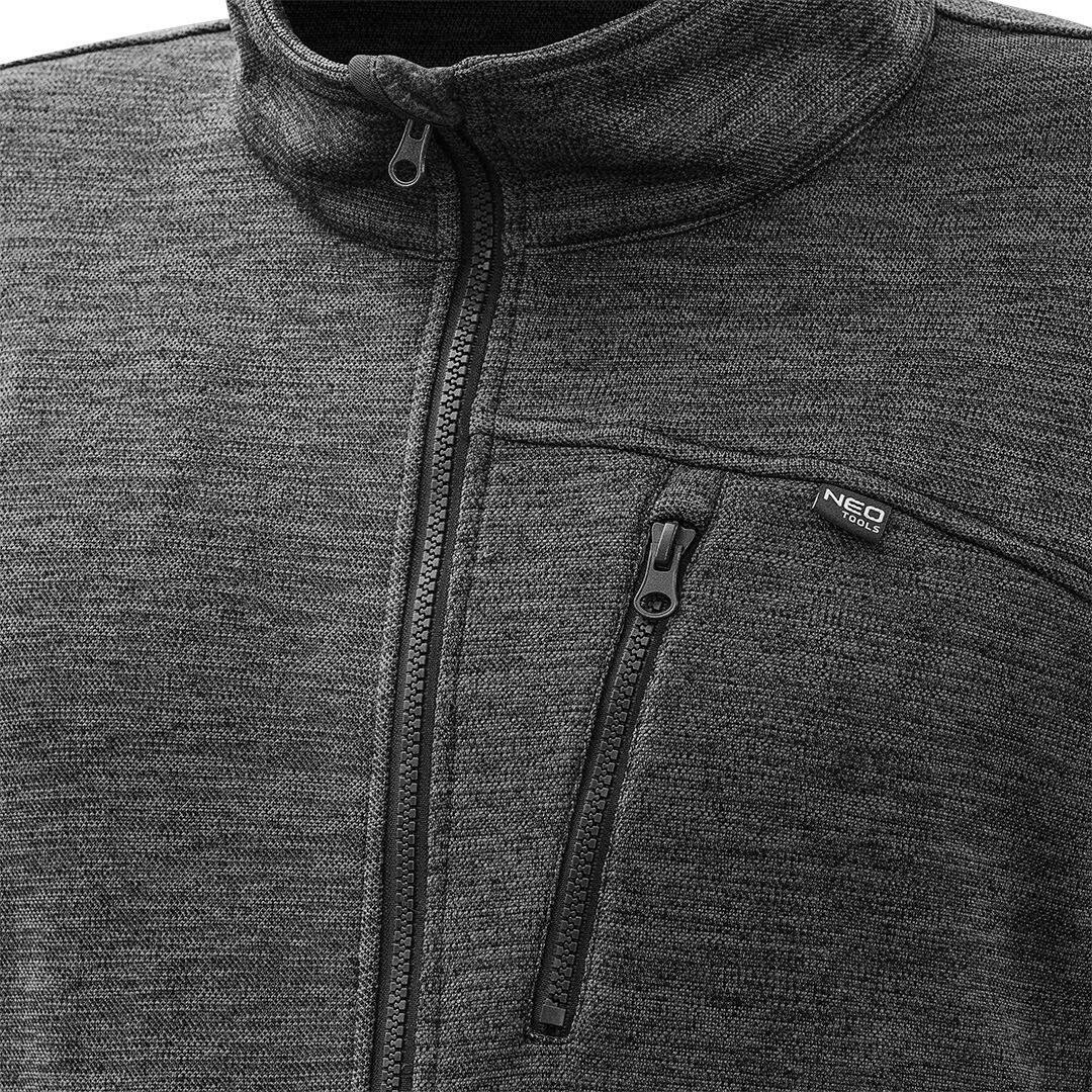 Bluza jest zapinana na solidny zamek i wyposażona w przemyślane rozwiązania, takie jak ukośna kieszeń piersiowa oraz boczne kieszenie, wszystkie zapinane na zamek, co zapewnia bezpieczne przechowywanie drobnych przedmiotów. Boczne panele podkreślają sylwetkę, a elastyczna lamówka na dole rękawów zapobiega ich przesuwaniu się podczas pracy, co zwiększa komfort użytkowania. Dodatkowo, bluza posiada zabezpieczenie przed elementami zamka, co chroni przed podrażnieniami. Subtelna metka z logiem NEO Tools na wysokości piersi nadaje bluzie profesjonalny charakter.