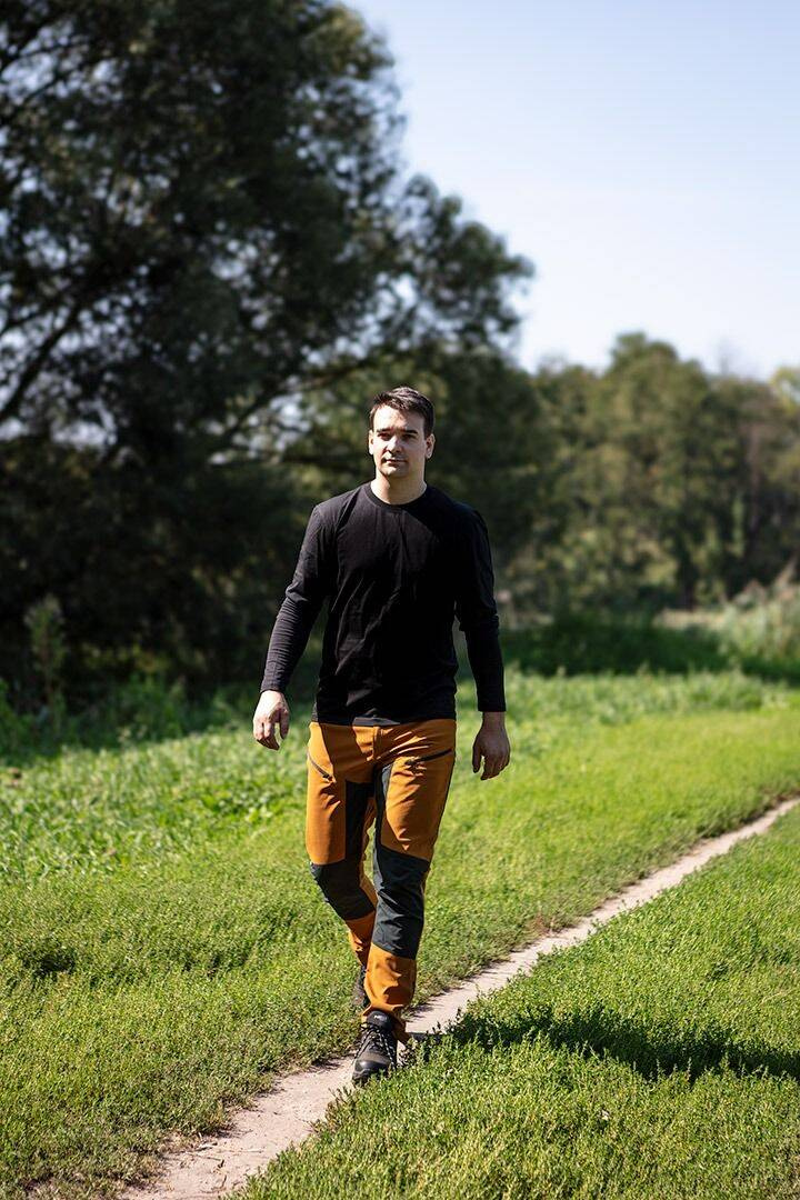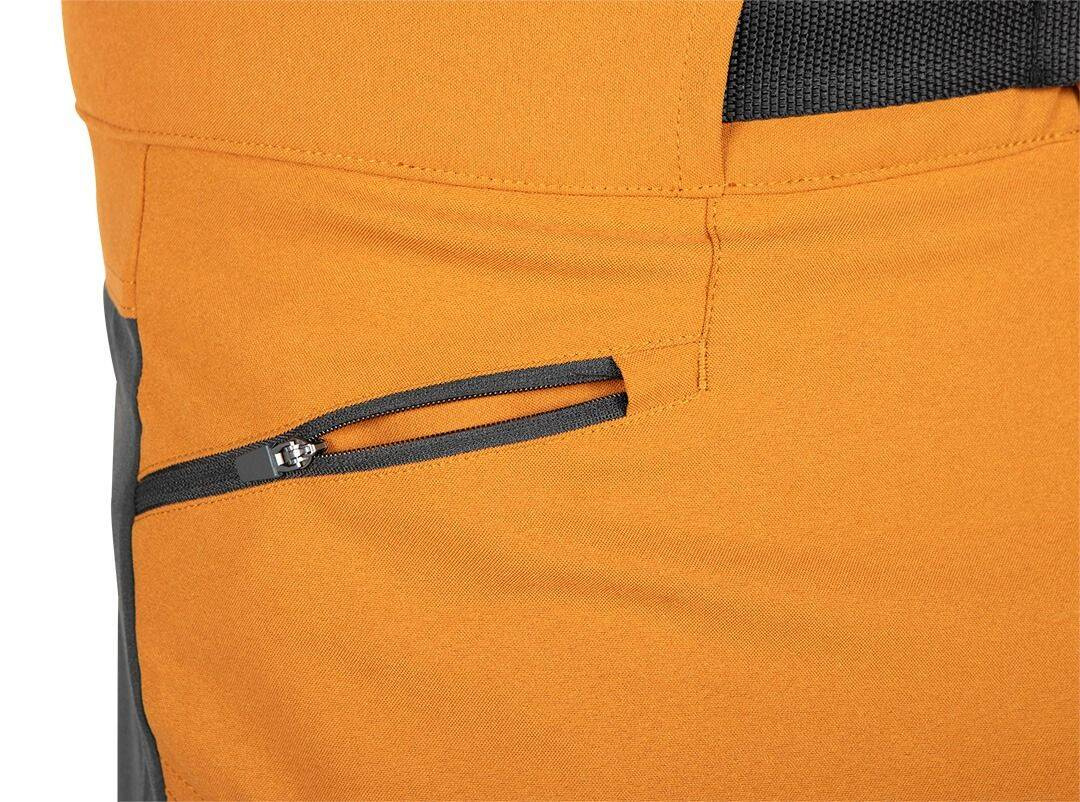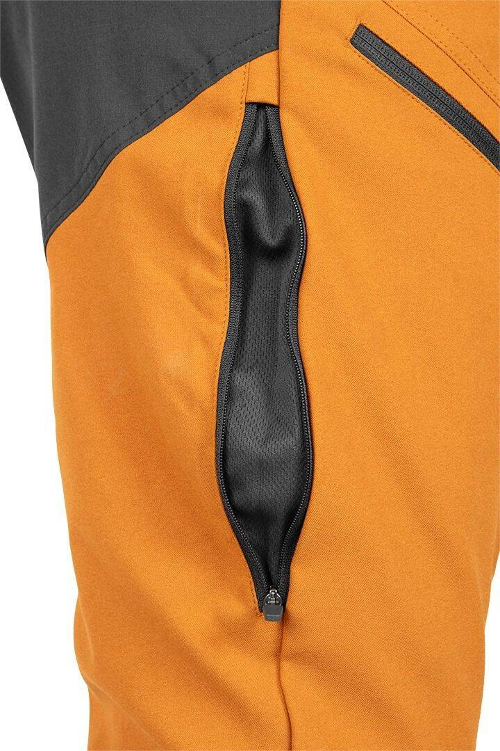 Spodnie w kolorze musztardowo-szarym z ciemnoszarymi wstawkami na udach i kolanach są nie tylko praktyczne, ale również stylowe. Kolorowe akcenty pomagają także w maskowaniu zabrudzeń, co jest istotne podczas pracy w trudnych warunkach. Spodnie wyposażono w kieszenie zapinane na zamek oraz w wentylację w szwach bocznych, co gwarantuje odpowiedni komfort termiczny i umożliwia wygodne przechowywanie narzędzi. Profilowane kolana oraz podwójna regulacja obwodu nogawki za pomocą rzepu i suwaka zapewniają elastyczność oraz optymalne dopasowanie do sylwetki.