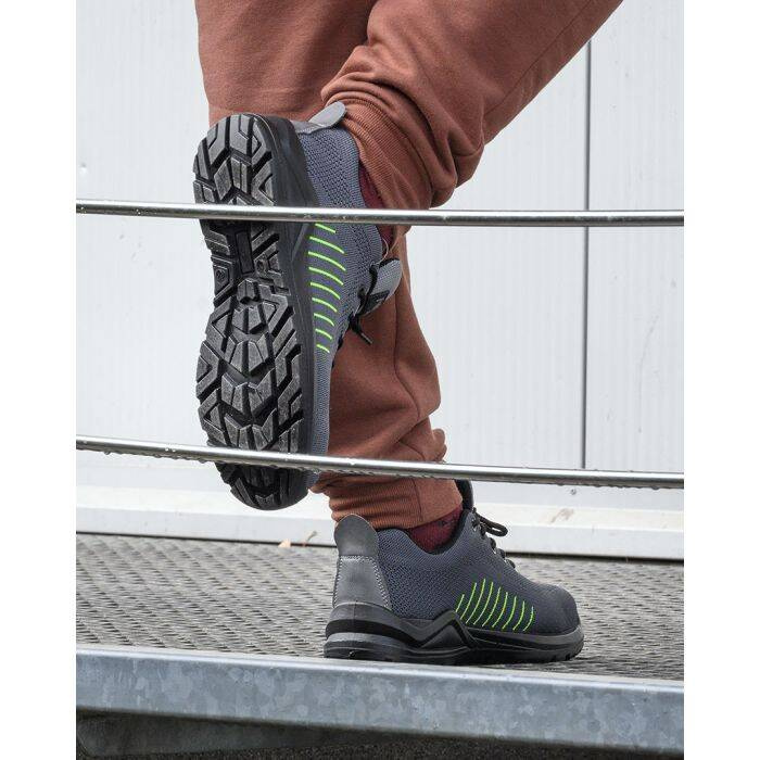 Cholewka półbutów wykonana jest z dzianiny typu flyknit, co gwarantuje lekkość i doskonałe dopasowanie do stopy. Wyściółka z siatkowej dzianiny zapewnia oddychalność, co zwiększa komfort noszenia nawet przy długotrwałym użytkowaniu. Podeszwa PU/PU z systemem absorpcji wstrząsów chroni stopy przed obciążeniami, a wkładka piankowa EVA dodatkowo podnosi wygodę. Obuwie spełnia normę EN ISO 20345, co jest potwierdzeniem zgodności z europejskimi standardami bezpieczeństwa.