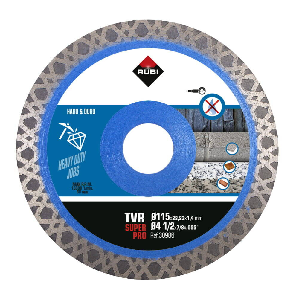 Tarcza diamentowa Rubi TVR 115 SUPERPRO to wysokiej jakości narzędzie przeznaczone do cięcia twardych materiałów budowlanych, takich jak granit, gres porcelanowy, klinkier, łupki czy materiały ogniotrwałe. Wyposażona w innowacyjne obrzeże diamentowe typu TURBO VIPER, tarcza łączy w sobie szybkość cięcia oraz doskonałą jakość wykończenia. Jej zaawansowana konstrukcja gwarantuje precyzję pracy, eliminując naprężenia podczas cięcia i zwiększając odporność na zginanie. Przeznaczona zarówno do szlifierek kątowych zasilanych sieciowo, jak i akumulatorowych, sprawdzi się w profesjonalnych i wymagających zastosowaniach. Tarcza TVR SUPERPRO jest szczególnie polecana do pracy na sucho, co czyni ją uniwersalnym narzędziem dla osób szukających niezawodności oraz trwałości.