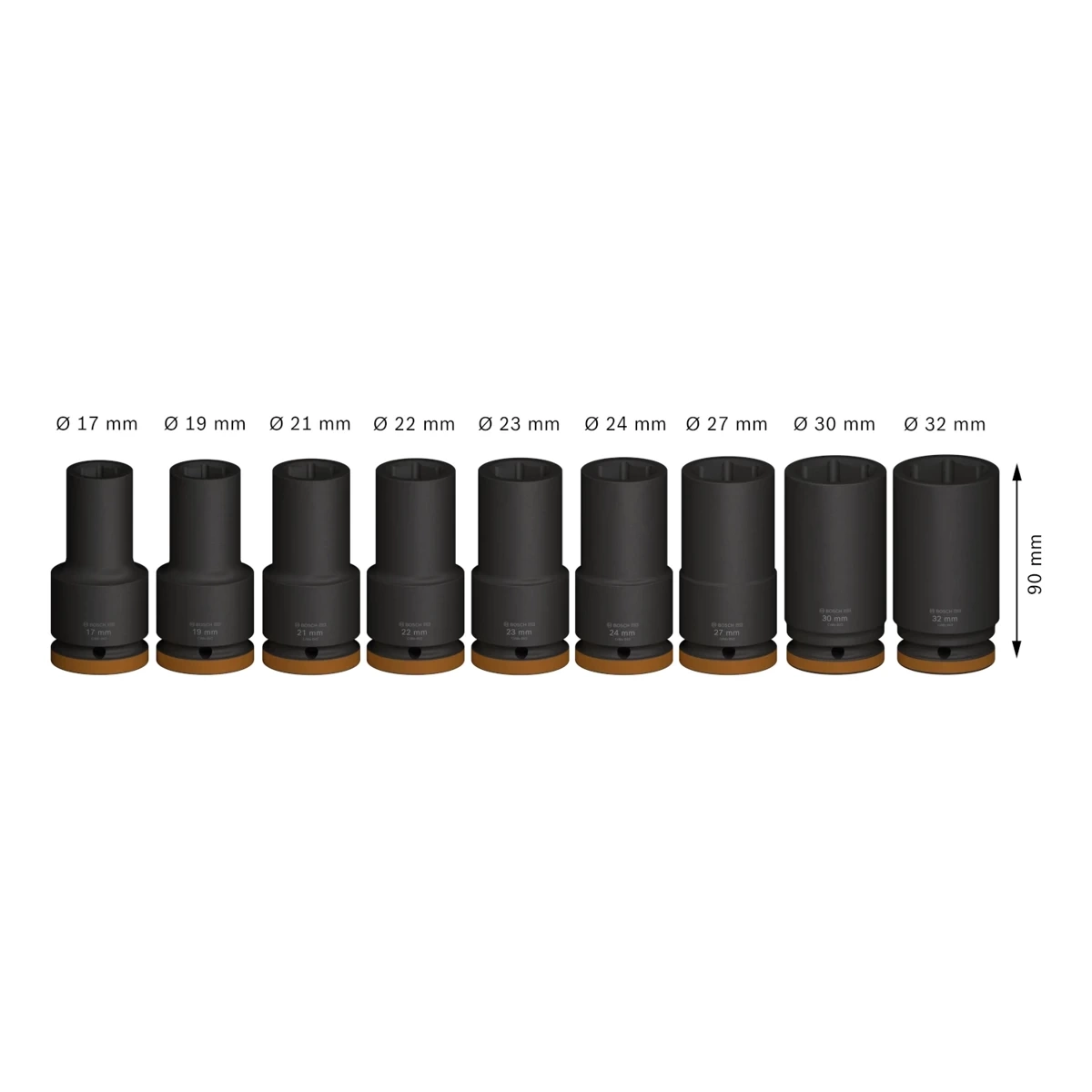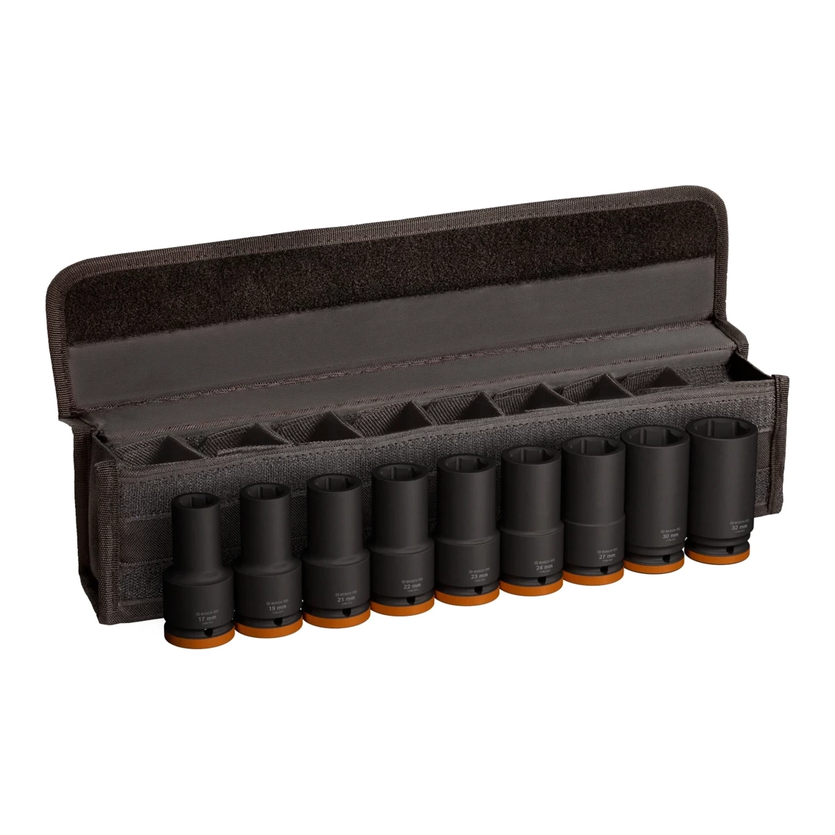 Zestaw nasadek 3/4" Bosch 2608003042 to profesjonalny komplet osprzętu idealny do intensywnej pracy na budowach i w warsztatach. Wykonane z trwałej stali chromowo-molibdenowej (CrMo) nasadki charakteryzują się odpornością na uszkodzenia i świetnie radzą sobie z dużymi obciążeniami. Zaprojektowane z myślą o niezawodności i wydajności, sprawdzają się przy wkręcaniu śrub i nakrętek z użyciem kluczy czworokątnych. Czarna powłoka fosforanowa zabezpiecza przed korozją, co gwarantuje długą żywotność nawet w trudnych warunkach. Laserowe oznaczenia oraz kolorowe kodowanie ułatwiają szybkie rozpoznanie właściwego rozmiaru. Każda nasadka ma rowek i otwór przelotowy, co zapewnia stabilne mocowanie na kluczu udarowym przy użyciu trzpienia z pierścieniem.