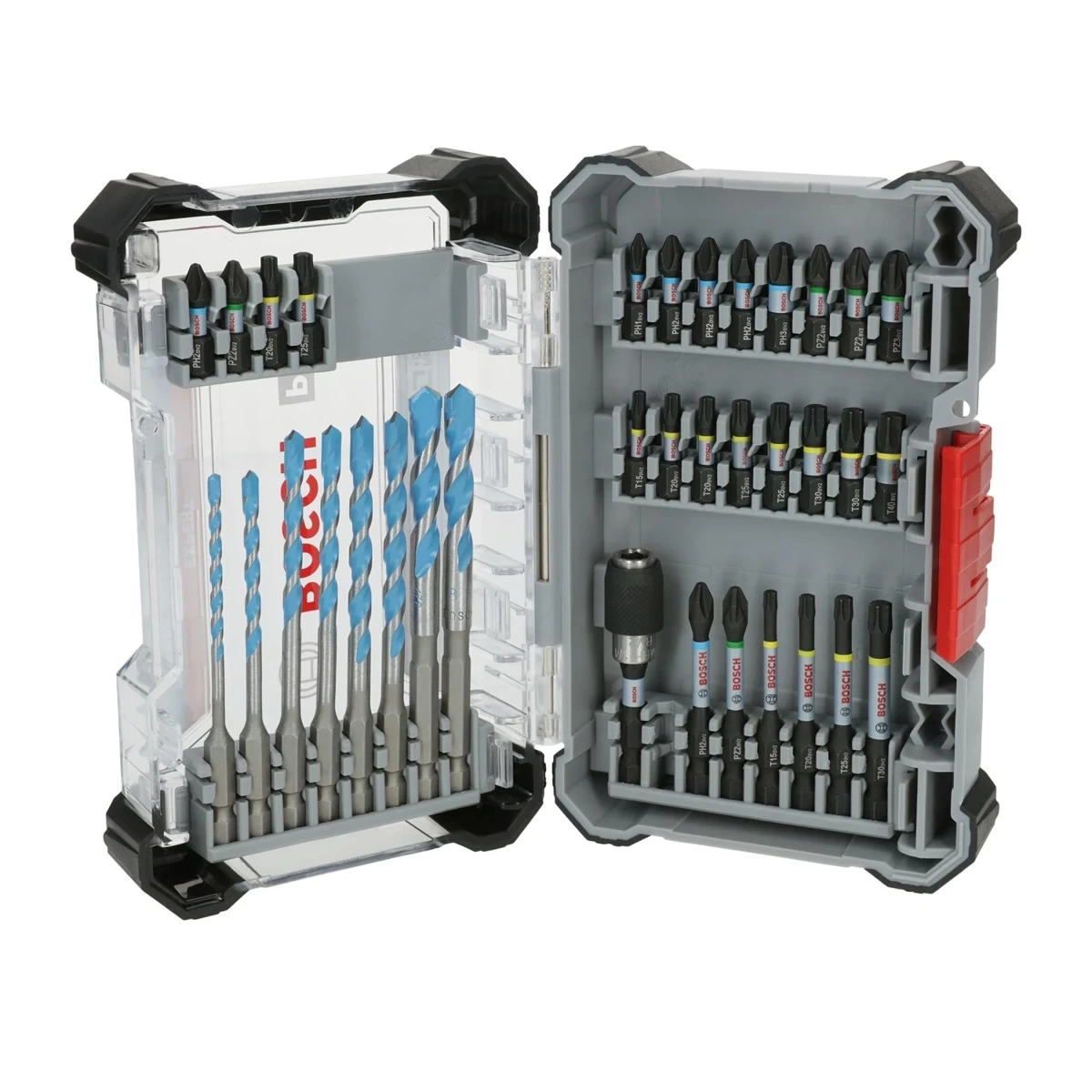 Zestaw bitów i wierteł Bosch 2608521U82 to wszechstronny i niezawodny komplet osprzętu przeznaczony zarówno do profesjonalnego, jak i amatorskiego użytku. Zestaw zawiera 8 wielozadaniowych wierteł Expert HEX-9 MultiConstruction, 26 bitów o różnych długościach oraz uchwyt Quick Change do szybkiej wymiany końcówek. Komplet sprawdzi się w zróżnicowanych zadaniach, takich jak wiercenie w betonie, drewnie, metalu czy tworzywach sztucznych. Wiertła HEX-9 MultiConstruction charakteryzują się spiralnym kształtem z szerokimi rowkami, które umożliwiają skuteczne odprowadzanie urobku, zapewniając szybkie i precyzyjne wiercenie. Wyposażone w końcówki z węglików spiekanych oraz geometrię Bosch Centering Geometry, wiertła pozwalają na precyzyjne wiercenie bez przesuwania. Bity PRO Impact z kolorowymi pierścieniami i oznaczeniami laserowymi ułatwiają szybki dobór odpowiedniego narzędzia, a strefa skręcania skutecznie absorbuje naprężenia, zapobiegając ich łamaniu.