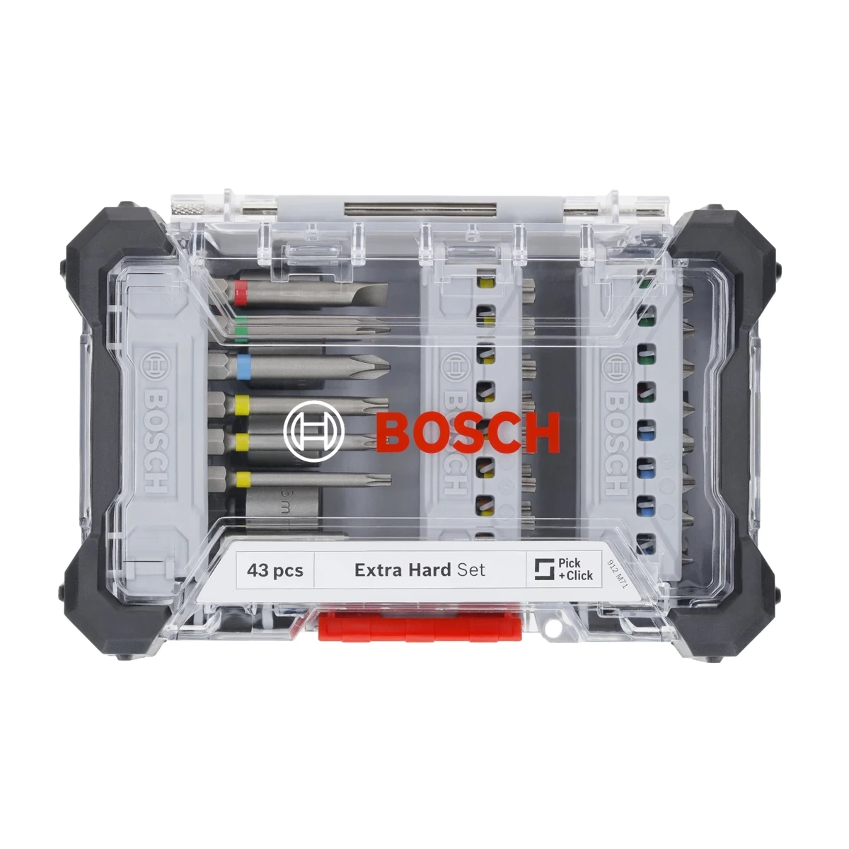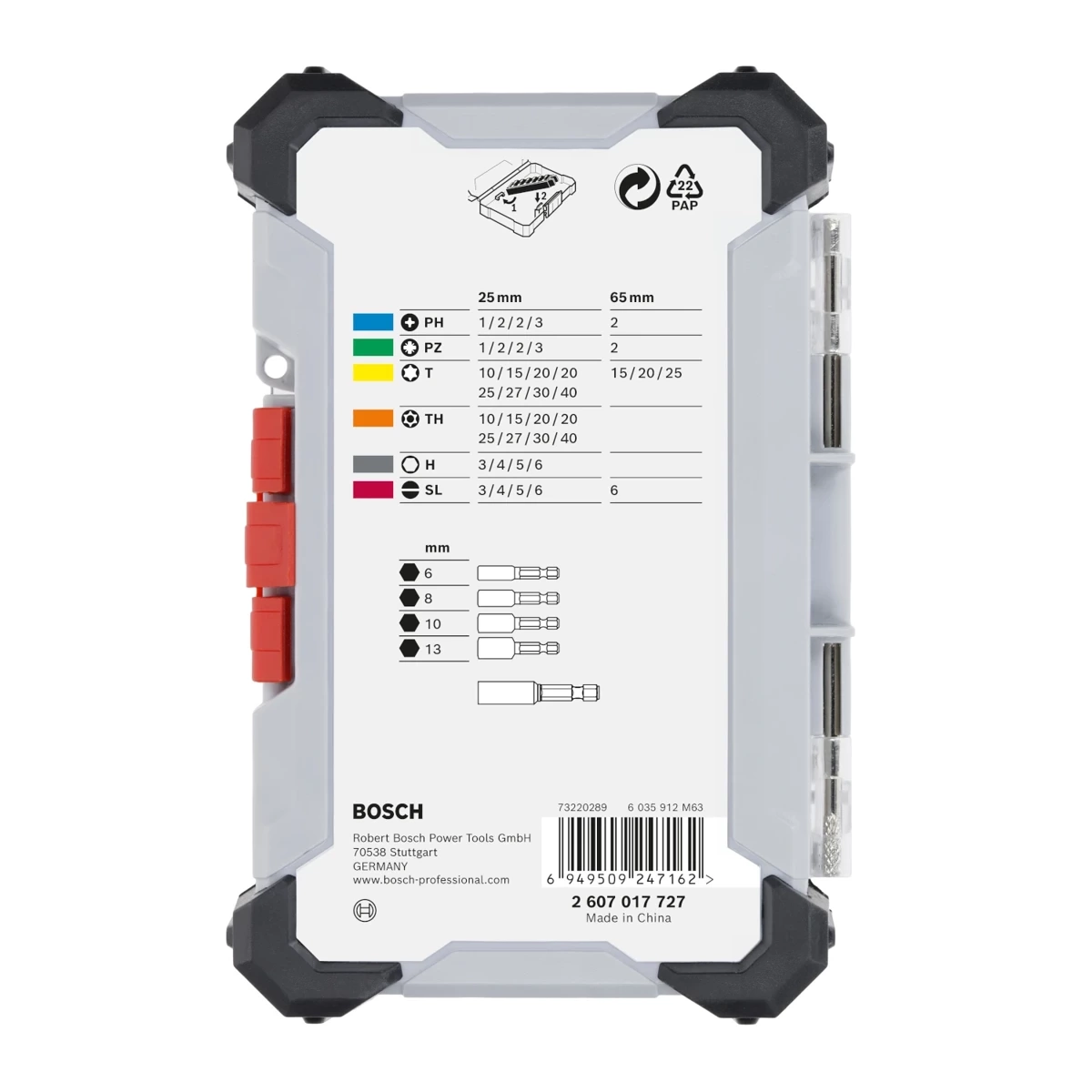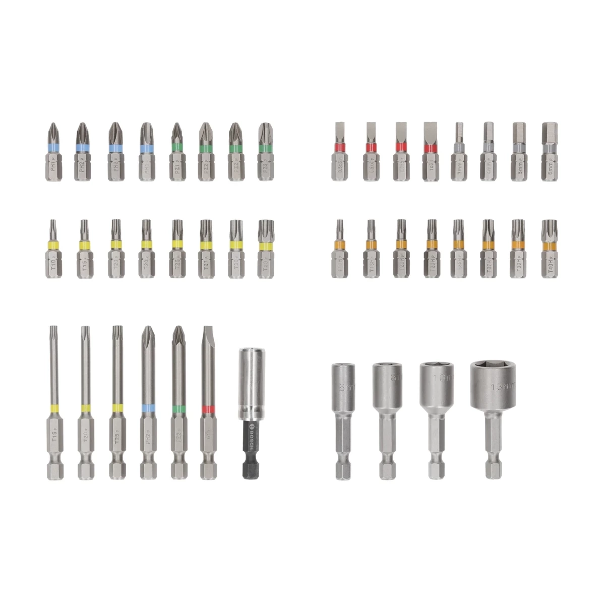 Zestaw bitów i wierteł Bosch 2607017727 to kompleksowe rozwiązanie dla wszystkich standardowych zadań związanych z wkręcaniem i wierceniem. W skład zestawu wchodzą aż 43 elementy, które pozwalają na precyzyjne dopasowanie do różnych typów śrub i wkrętów. Wszystkie bity zostały wykonane z modyfikowanej stali S2 poddanej profesjonalnej obróbce cieplnej, co zapewnia im wysoką twardość i odporność na zużycie. Dodatkowo kolorowe oznaczenia bitów umożliwiają szybkie i łatwe odnalezienie właściwej końcówki w trakcie pracy. Zestaw jest zapakowany w solidną plastikową walizkę typu Pick and Click, która nie tylko zapewnia porządek, ale również ochronę elementów w trakcie transportu. Walizka pozwala również na rozbudowę zestawu zgodnie z indywidualnymi potrzebami użytkownika. Wszystkie bity w komplecie posiadają uchwyt sześciokątny 1/4 cala, dzięki czemu mogą być stosowane zarówno w wiertarkach z uchwytem szczękowym, jak i w wkrętarkach z uchwytem sześciokątnym.