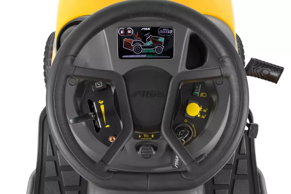 Traktor ogrodowy Stiga Estate 9122 W został zaprojektowany z myślą o maksymalnym komforcie użytkowania. Ergonomiczne siedzenie Comfort Plus z podłokietnikami, miękka kierownica STIGA Premium oraz funkcja tempomatu sprawiają, że nawet długotrwała praca jest wygodna. Wyświetlacz LED o przekątnej 5,5" ułatwia monitorowanie kluczowych parametrów, a mocne reflektory LED umożliwiają pracę nawet po zmroku. Dodatkowo, hydrostatyczna przekładnia sterowana nożnie pozwala na płynne i łatwe manewrowanie.