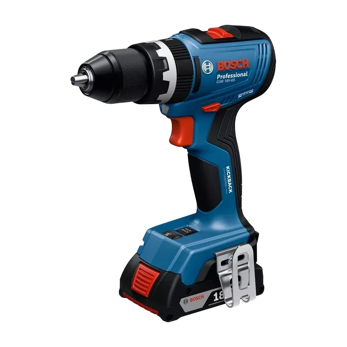 Wiertarko-wkrętarka Bosch GSB 18V-65 (06019N3303) to akumulatorowe narzędzie z funkcją udaru, łączące kompaktową konstrukcję z wysoką wydajnością i przystosowane do szerokiego zakresu zastosowań. Wyposażone w bezszczotkowy silnik urządzenie doskonale radzi sobie z wierceniem i wkręcaniem w różne materiały, takie jak drewno, metal, tworzywa sztuczne czy cegły. Dzięki długości korpusu wynoszącej jedynie 175 mm oraz lekkiej budowie, produkt jest wygodny w użyciu i niezastąpiony w trudno dostępnych miejscach. Model ten cechują funkcjonalne rozwiązania, takie jak KickBack Control czy podwójne oświetlenie LED. Dwa biegi z możliwością regulacji momentu obrotowego, zwiększają precyzję, komfort i bezpieczeństwo pracy, z kolei metalowy uchwyt wiertarski zapewnia szybkie i stabilne mocowanie osprzętu. To uniwersalne urządzenie, które sprawdzi się w branżach takich jak stolarka, budownictwo czy elektryka, jak również w użytku domowym.