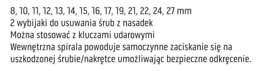 - Nasadki: 8, 10, 11, 12, 13, 14, 15, 16, 17, 19, 21, 22, 24, 27 mm