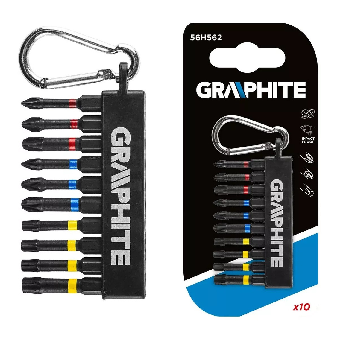 Zestaw bitów udarowych Graphite 56H562 to komplet 10 wytrzymałych końcówek przeznaczonych do pracy z wkrętarkami i zakrętarkami udarowymi. Wykonane z wysokogatunkowej stali S2, zapewniają zwiększoną elastyczność i odporność na uszkodzenia mechaniczne. Specjalna strefa skrętna redukuje przenoszenie siły podczas obrotu, co minimalizuje ryzyko złamania bitów i znacząco wydłuża ich żywotność. Zestaw zawiera końcówki PH, PZ i TX o długości 50 mm, a praktyczny karabińczyk umożliwia ich wygodne mocowanie do paska lub narzędzi.