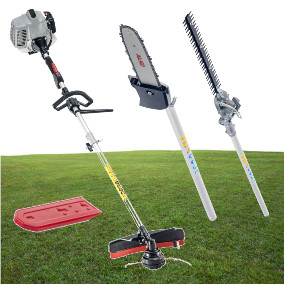 Urządzenie wielofunkcyjne spalinowe AL-KO BC 260 MT to wszechstronne narzędzie, które łączy w sobie funkcje podkaszarki, okrzesywarki łańcuchowej oraz nożyc do żywopłotu, oferując kompleksowe rozwiązanie do pielęgnacji ogrodu. Dzięki wymiennym końcówkom użytkownik może błyskawicznie dostosować sprzęt do aktualnych potrzeb. W zestawie znajduje się głowica żyłkowa o szerokości cięcia 41 cm, idealna do precyzyjnego koszenia trudno dostępnych miejsc. Okrzesywarka łańcuchowa wyposażona w prowadnicę o długości 25,4 cm, doskonale sprawdzająca się przy przycinaniu gałęzi na wysokości. Nożyce do żywopłotu z 46 cm ostrzem, pozwalające na dokładne formowanie krzewów i żywopłotów.
