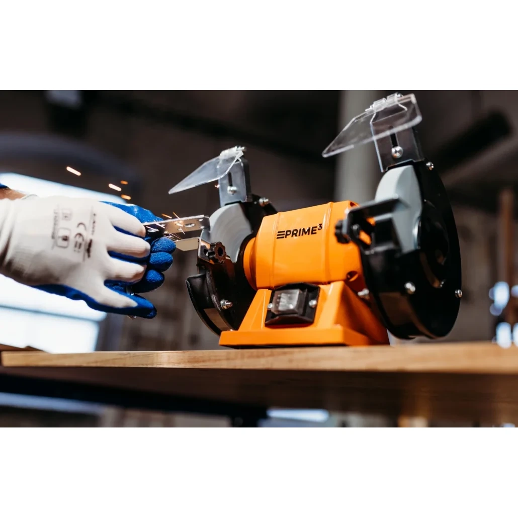 Model Prime3 TBG21 cechuje się solidną, metalową konstrukcją, która zapewnia stabilność pracy oraz długą żywotność sprzętu. Urządzenie wykorzystuje dwa kamienie szlifierskie o wymiarach 150 x 20 mm i otworach o średnicy 12,7 mm, co gwarantuje kompatybilność z szeroką gamą tarcz. Szlifierka oferuje dwie ściernice o różnej ziarnistości – P36 do szybkiego usuwania większej ilości materiału oraz P60 do precyzyjnego wykończenia powierzchni.