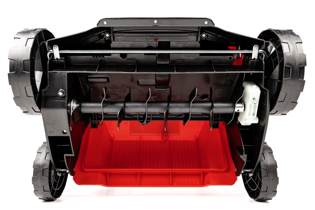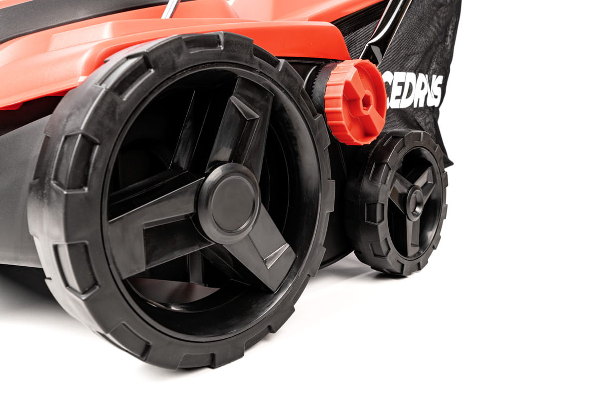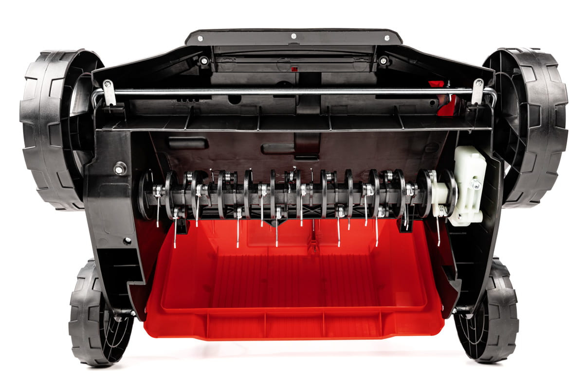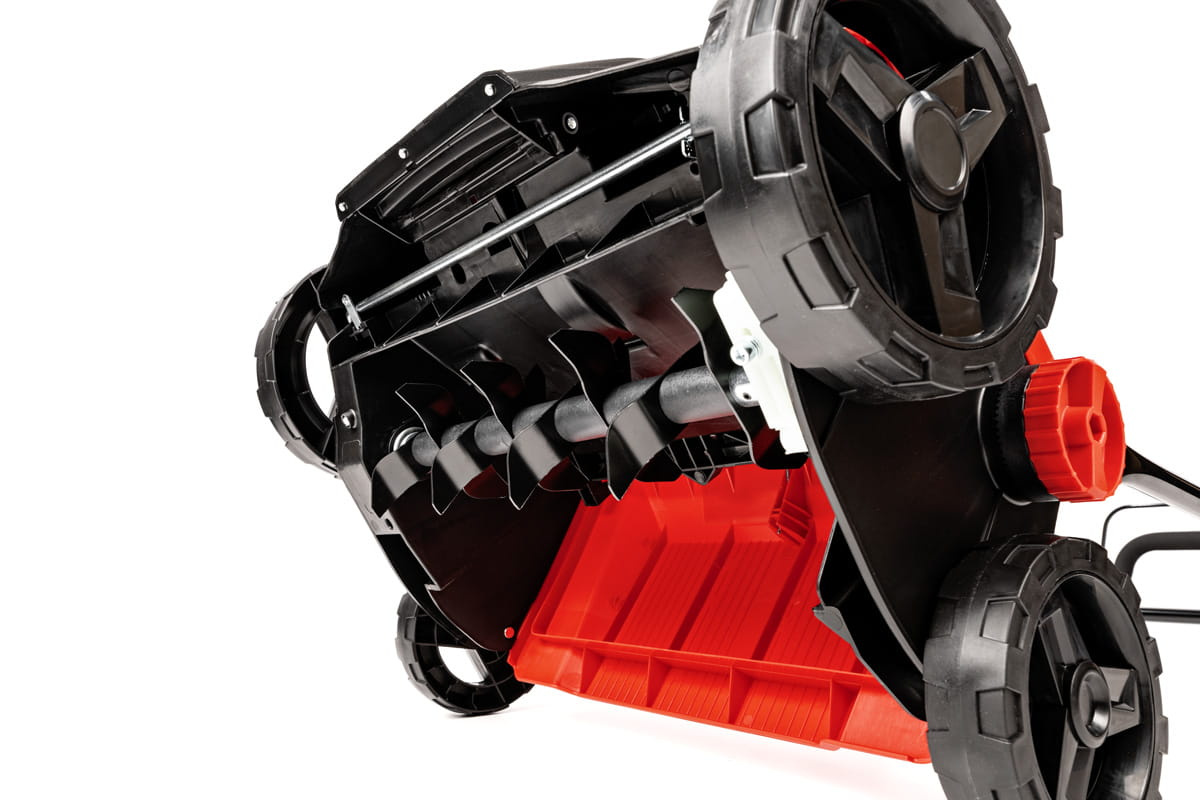Cedrus WE38 posiada dwa wymienne wałki: jeden z nożami stalowymi (16 sztuk) do wertykulacji oraz drugi ze sprężynami stalowymi do aeracji. Szerokość robocza urządzenia wynosi 38 cm, co umożliwia sprawne i szybkie przeprowadzenie zabiegów pielęgnacyjnych na większych powierzchniach. Głębokość pracy można precyzyjnie ustawić dzięki 6-stopniowej, centralnej regulacji w zakresie od +6 mm do -12 mm, co pozwala dostosować urządzenie do aktualnych potrzeb trawnika.