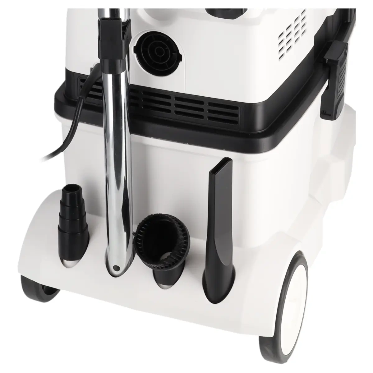 Urządzenie umożliwia odkurzanie zarówno na sucho, jak i na mokro, co czyni je wszechstronnym narzędziem do zbierania kurzu, gruzu, cieczy czy błota. Funkcja automatycznego odcięcia zasilania przy pełnym zbiorniku wody chroni silnik przed uszkodzeniem, a możliwość zdalnego sterowania odkurzaczem za pomocą pilota zwiększa komfort obsługi, zwłaszcza podczas pracy z elektronarzędziami.