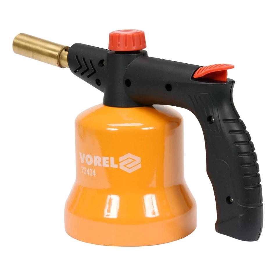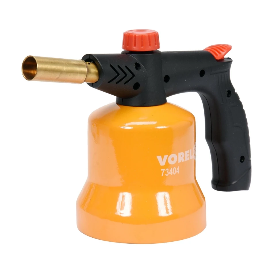 Palnik gazowy Vorel 73404 to poręczne i uniwersalne rozwiązanie do szerokiego zakresu zastosowań. Produkt wyposażono w zapłon piezoelektryczny, umożliwiający łatwe i bezpieczne uruchamianie bez konieczności użycia zewnętrznego źródła ognia. Palnik zasilany jest butanem z nabojów typu EN417 o pojemności 190 g, co zapewnia wygodę i dostępność paliwa. Urządzenie osiąga temperaturę płomienia do 850 °C i oferuje moc 1,7 kW, dzięki czemu sprawdza się przy lutowaniu miękkim, cynowaniu, nagrzewaniu, luzowaniu zapieczonych śrub, a także opalaniu farb czy odmrażaniu. Dodatkowo umożliwia regulację intensywności płomienia, pozwalając dopasować jego siłę do konkretnego zadania. Konstrukcja palnika pozwala na bezpieczną pracę pod kątem 360°, co znacząco zwiększa jego funkcjonalność i wygodę użytkowania, nawet w trudno dostępnych miejscach. Metalowa obudowa zwiększa trwałość produktu i odporność na uszkodzenia mechaniczne.