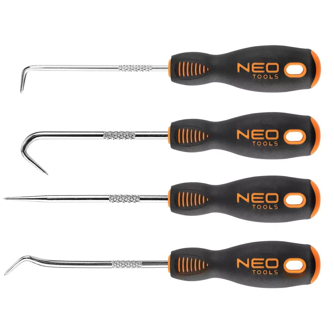 Zestaw 4 szt. haków 150 mm NEO Tools 04-231 to wielozadaniowy zestaw haków z rękojeścią wkrętakową o długość 140 mm, wyposażone w wytrzymały grot ze stali chromowo-wanadowej. Uchwyty pokryte są tworzywem TPR, słynącym z wysokiej odporności na działania olejów mineralnych, smarów czy chemikaliów. Zestaw haków od marki NEO rekomendowany jest do szerokiego zakresu zadań.