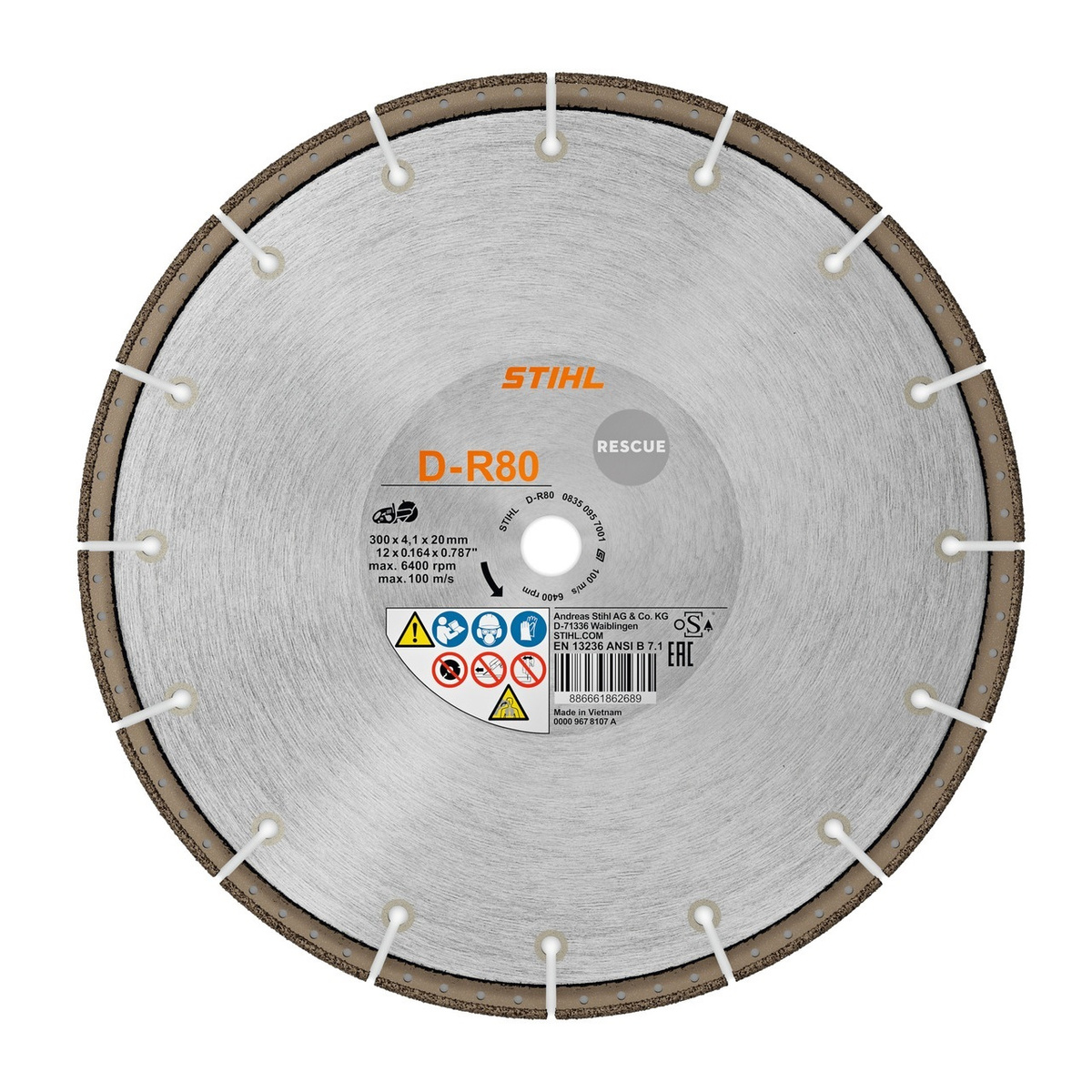 Tarcza diamentowa Stihl D-R80 o średnicy 300 mm (08350957001) to specjalistyczne narzędzie tnące zaprojektowane do użytku w sytuacjach awaryjnych, przeznaczone wyłącznie dla wykwalifikowanego personelu straży pożarnej oraz służb ratowniczych. Stanowi standardowe wyposażenie przecinarki ratowniczej TSA 300 R i jest kompatybilna z modelami STIHL TSA 300, TS 410 oraz TS 480i. Tarcza D-R80 wyróżnia się uniwersalnością zastosowania — została przetestowana pod kątem cięcia szerokiego zakresu materiałów, które mogą występować podczas akcji ratunkowych, takich jak metalowe bariery, tworzywa sztuczne, materiały budowlane czy szkło zespolone. Dzięki swojej wytrzymałości i konstrukcji, tarcza ta umożliwia szybkie i skuteczne usuwanie przeszkód w sytuacjach zagrożenia życia.