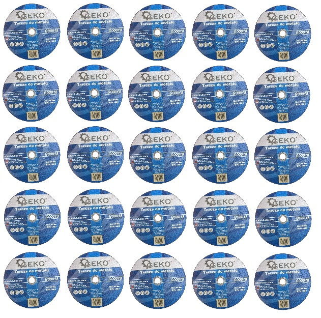 Zestaw tarcz do cięcia metalu GEKO G00018 to komplet 25 płaskich ściernic o wymiarach 230 × 2,5 × 22,23 mm, przeznaczonych do pracy ze szlifierkami kątowymi. Tarcze wykonane są z tlenku glinu, ziarna ściernego o wysokiej trwałości, osadzonego w spoiwie z żywicy syntetycznej i wzmocnionego włóknem szklanym. Dzięki cienkiej konstrukcji zapewniają precyzyjne cięcie oraz niski poziom zadziorów. Nadają się do szybkiego i efektywnego przecinania stali konstrukcyjnej, blach, rur oraz metali nieżelaznych i tworzyw sztucznych, przy jednoczesnym ograniczeniu nagrzewania obrabianego materiału.