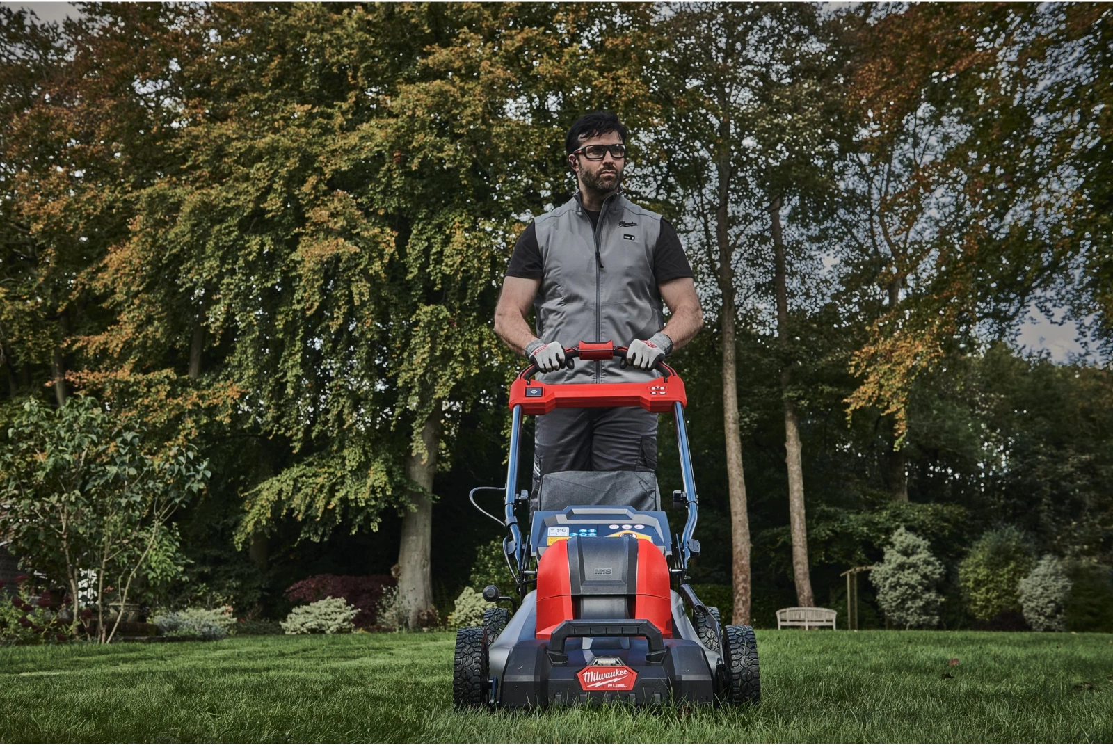 Napęd z 5-stopniową regulacją prędkości jazdy (do 6,5 km/h) pozwala na płynne prowadzenie urządzenia, a ergonomiczna dźwignia ułatwia precyzyjną kontrolę nad ruchem. Zasilanie dwoma akumulatorami 18V z serii HIGH OUTPUT™ umożliwia skoszenie do 1600 m² na jednym ładowaniu. Dodatkowo przedni reflektor LED poprawia widoczność w słabszych warunkach oświetleniowych.