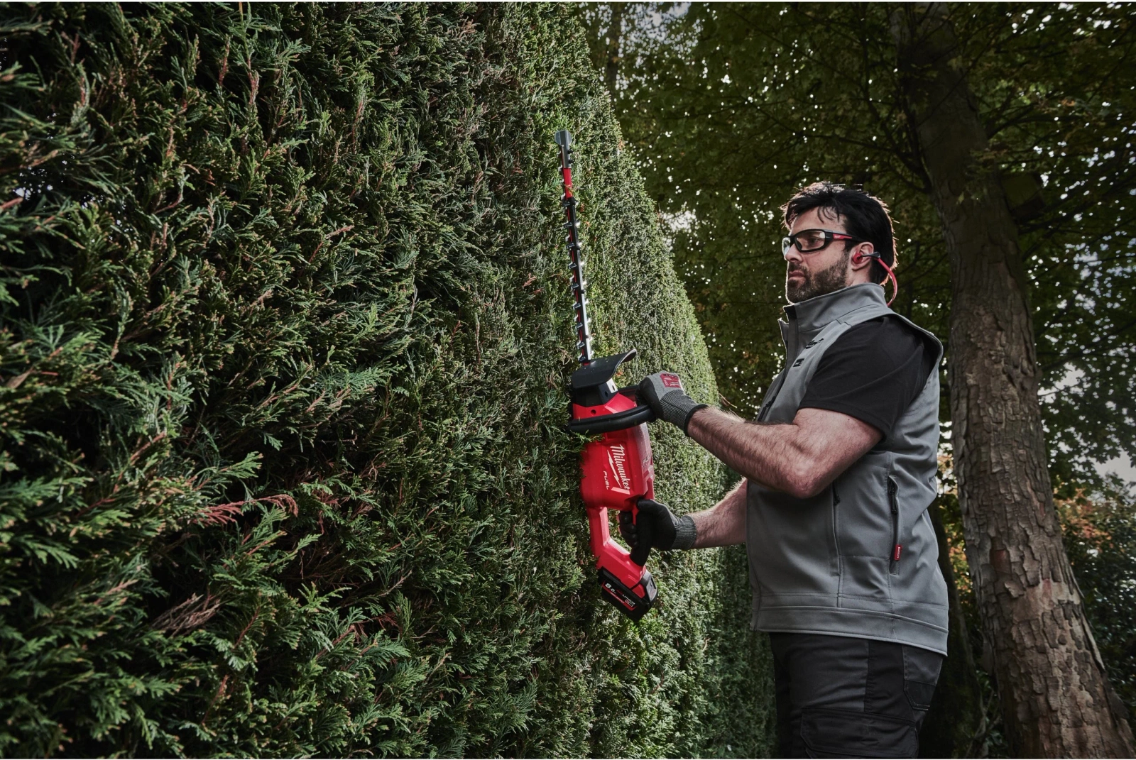 Długość ostrza wynosząca 60 cm pozwala na cięcie większych powierzchni w krótszym czasie, a maksymalna średnica cięcia gałęzi do 20 mm umożliwia pracę z grubszym materiałem. Metalowa obudowa przekładni chroni układ napędowy, zapewniając trwałość i niezawodność nawet w trudnych warunkach. Osłona końcówki ostrza zabezpiecza przed przypadkowym uszkodzeniem ogrodzenia lub innych elementów otoczenia. Nożyce osiągają do 3400 skoków na minutę, co przekłada się na wysoką efektywność pracy. Model M18 FHET60-0 sprzedawany jest bez akumulatora i ładowarki.