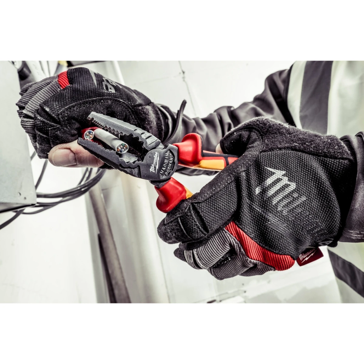 Szczypce uniwersalne VDE 165 mm Milwaukee 4932464571 to niezawodne narzędzie przeznaczone do pracy przy instalacjach elektrycznych. Przetestowane pod kątem napięcia do 10 000 V i dopuszczone do pracy pod napięciem do 1000 V, zapewnia wysoki poziom bezpieczeństwa. Kuta i hartowana głowica została pokryta powłoką tytanową, co zwiększa odporność na korozję i eliminuje odbicia światła. Indukcyjnie hartowane ostrza gwarantują długą żywotność i precyzyjne cięcie. Szczypce wyposażono w ergonomiczną rękojeść, która ułatwia przenoszenie siły na ostrza, a zoptymalizowana przekładnia dźwigniowa umożliwia komfortową pracę nawet przy większym obciążeniu.