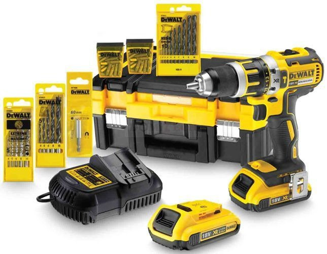 • DeWalt DCK795D2T to wiertarko-wkrętarka o napięciu 18 V, 60 Nm, uchwyt wiertarski 13 mm, Udar, 2 prędkości. Dwa akumulatory Li-ion 2.0 Ah, ładowarka wielonapięciowa, zestaw akcesoriów.