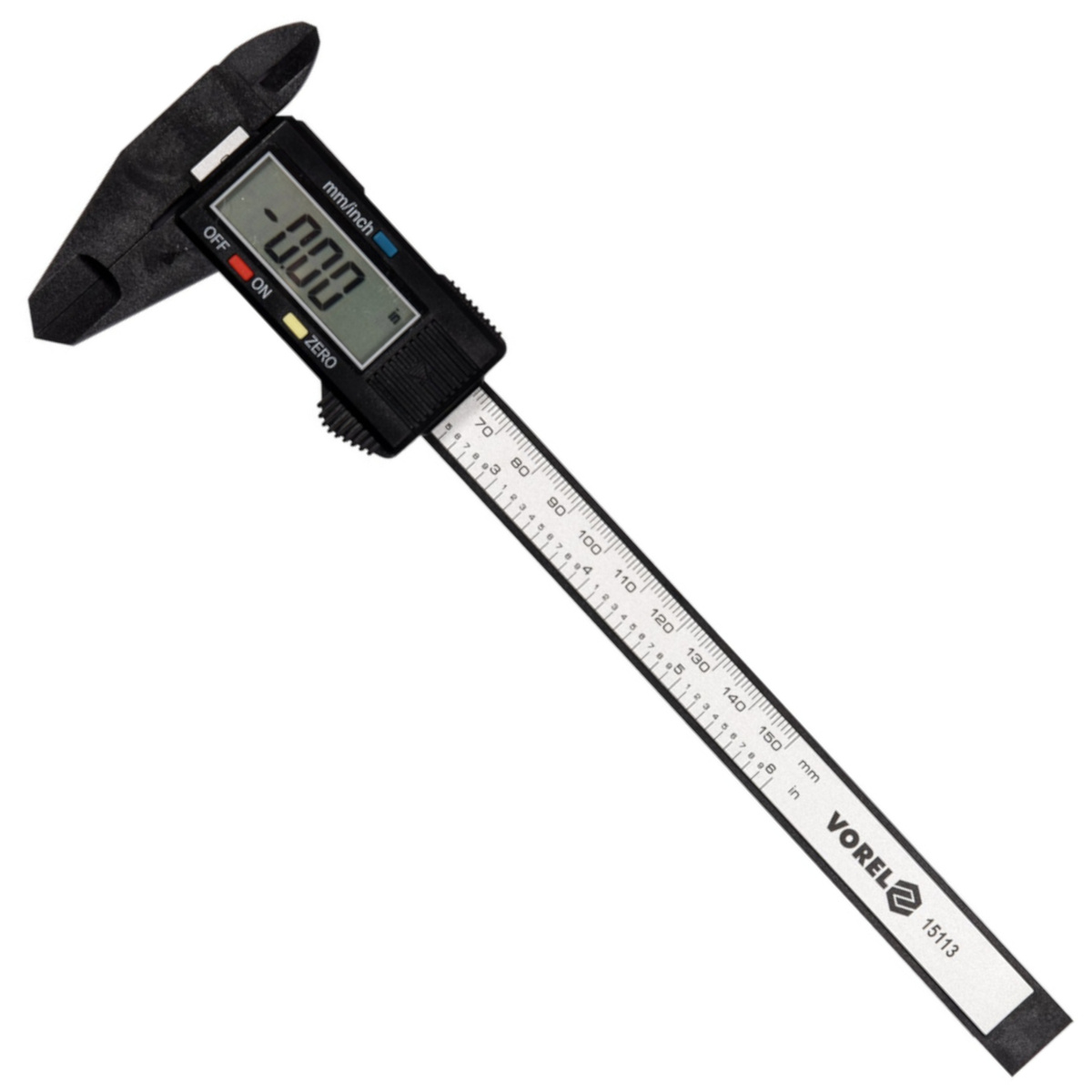 Suwmiarka elektroniczna 150 mm Vorel 15113 to poręczne narzędzie pomiarowe z zakresem 0 – 150 mm, idealne do użytku domowego, warsztatowego i hobbystycznego. Dzięki zastosowaniu lekkiego i odpornego na korozję włókna węglowego (carbonu), narzędzie charakteryzuje się niską masą oraz trwałością. Suwmiarka umożliwia precyzyjne pomiary zewnętrzne, wewnętrzne i głębokościowe, a czytelny wyświetlacz LCD zapewnia wygodny odczyt w milimetrach lub calach. Model 15113 wyposażono w funkcję automatycznego, kiedy urządzenie nie jest używane. Suwmiarka jest zasilana za pomocą baterii LR44.