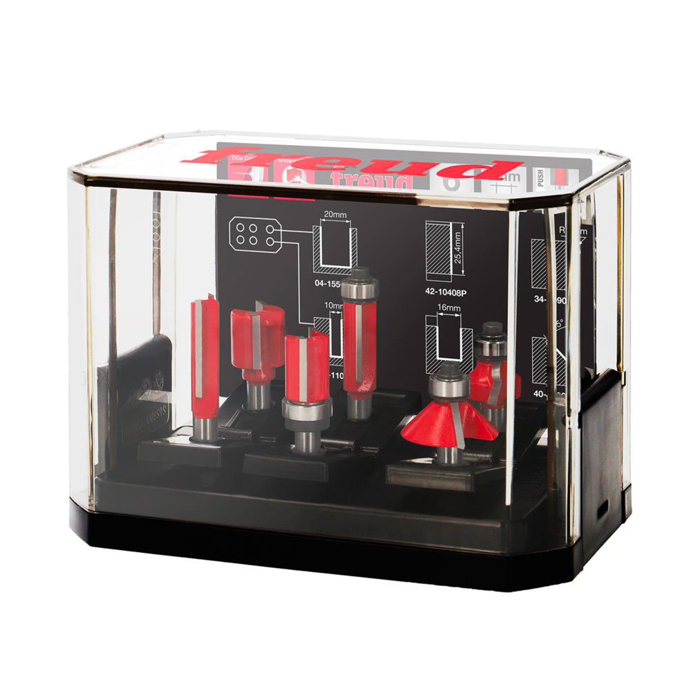 Wszystkie frezy zostały wykonane z trwałego węglika spiekanego (HM) oraz pokryte powłoką Perma-SHIELD, która chroni przed przegrzewaniem, korozją i osadzaniem się żywicy. Mechanizm „Hold & Release” zapewnia bezpieczne przechowywanie i łatwe wyjmowanie frezów z opakowania. Całość zapakowana jest w kompaktową, solidną walizkę transportową.