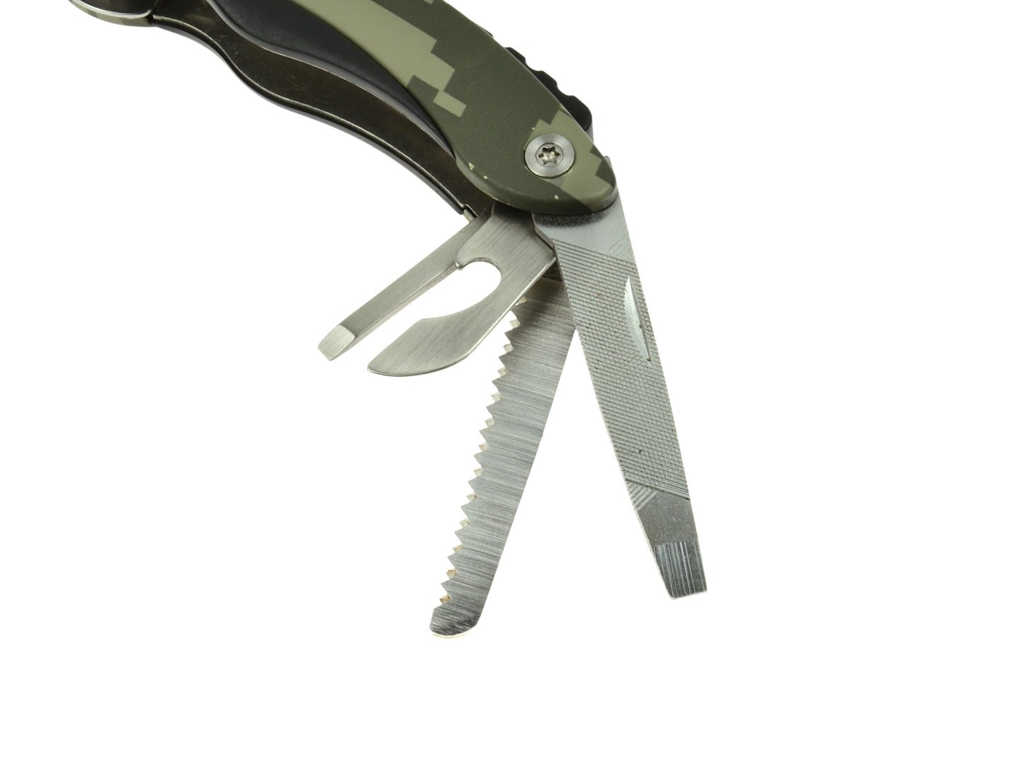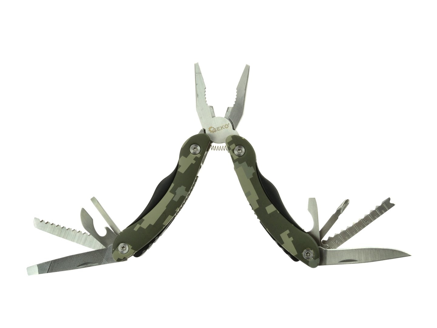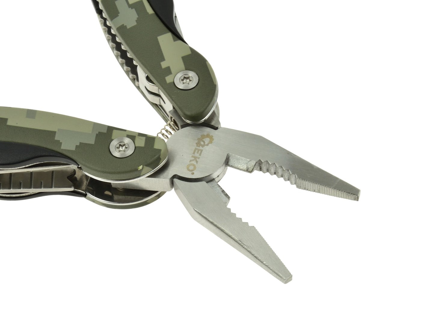 Multitool Geko G02413 to poręczne, wielofunkcyjne narzędzie, które łączy w sobie szereg przydatnych funkcji w jednej kompaktowej formie. Zestaw zawiera aż 11 narzędzi wykonanych ze stali nierdzewnej, dzięki czemu multitool sprawdzi się zarówno w pracach domowych, jak i w terenie. Wyposażony jest w solidne kombinerki z mechanizmem sprężynowym, różne rodzaje śrubokrętów, ostrze, piłę, pilnik i otwieracze. Antypoślizgowa rękojeść z kompozytu i stali zapewnia pewny chwyt, a dołączone nylonowe etui umożliwia wygodne przenoszenie.